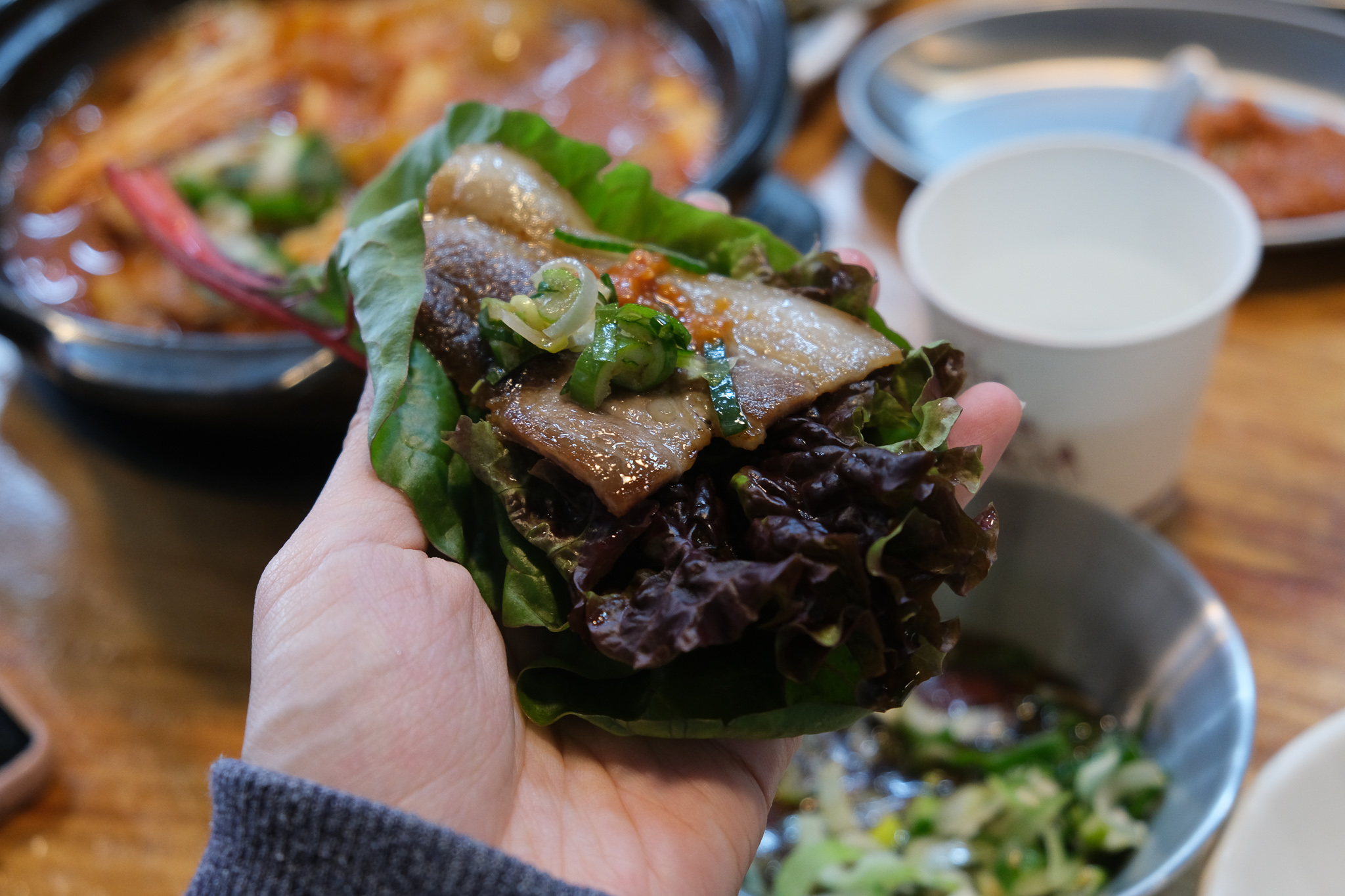 상추 위에 고기 얹고 특제 소스에 버무려진 파도 올렸다.