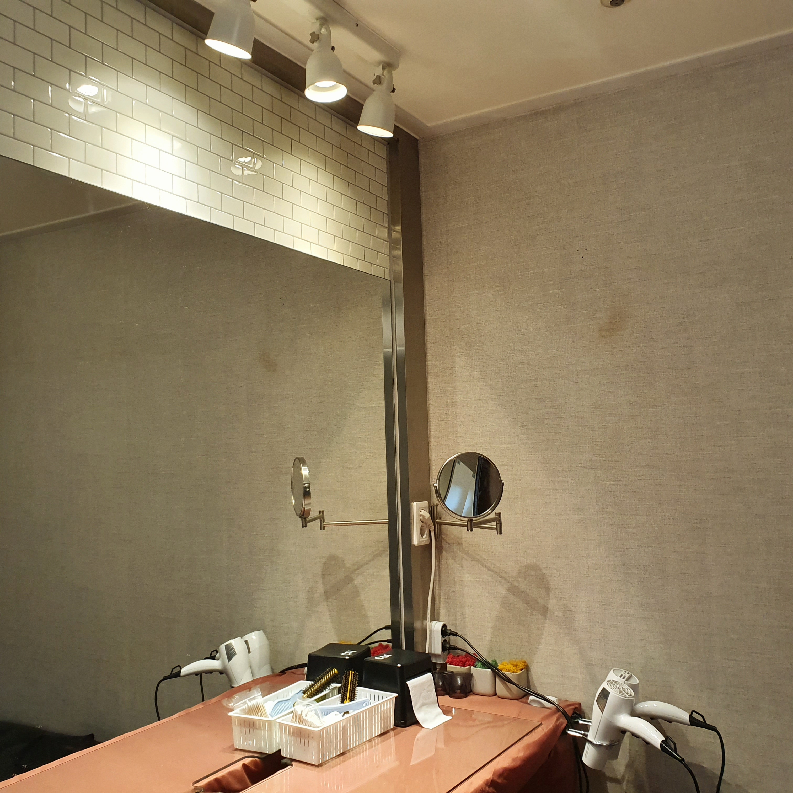 화장대에 드라이기랑 빗이 가지런히 정리되어 있었다.