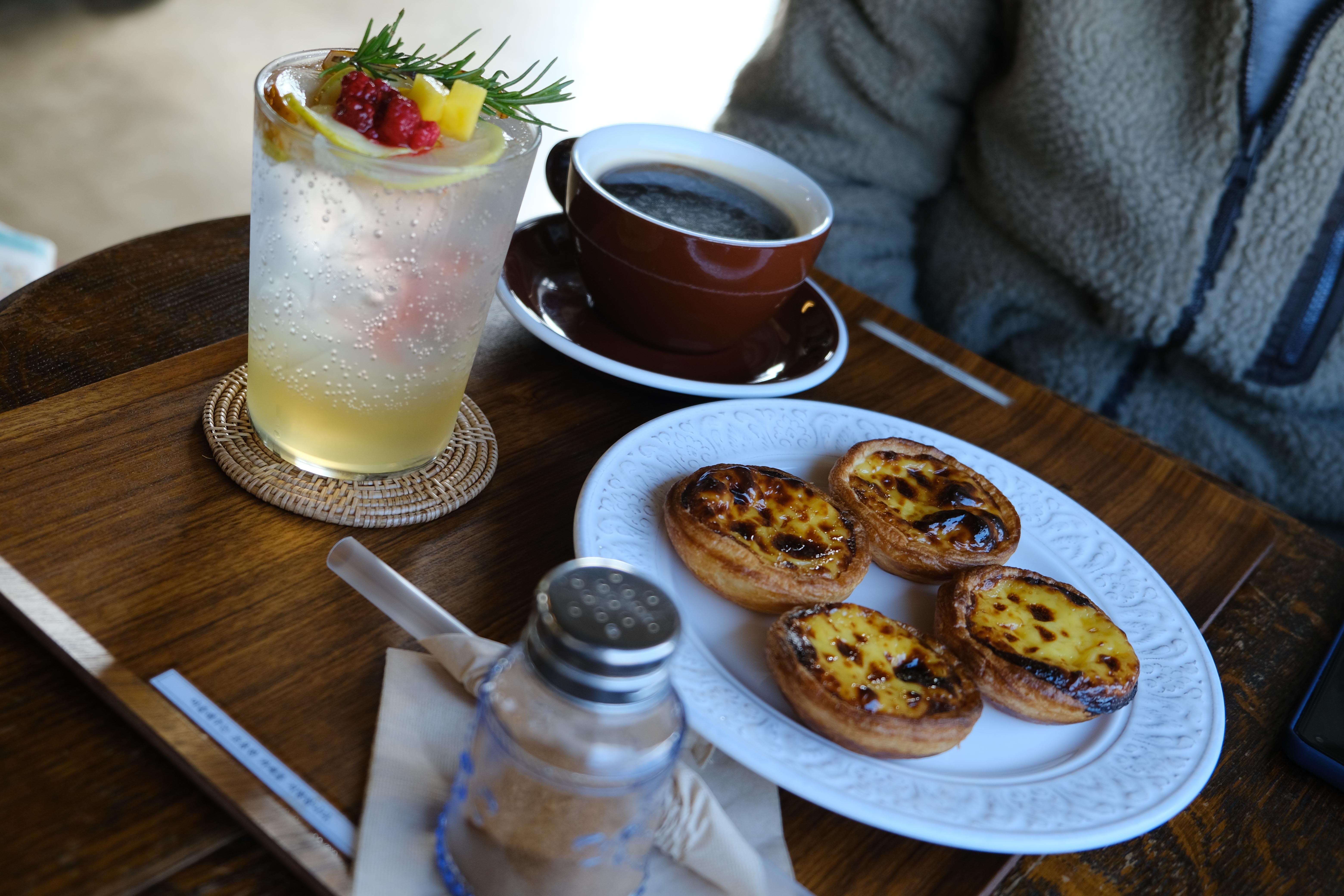 (1인 1음료 원칙인 집이라서 카페에서 먹고 가려면 1인 1음료를 주문해야 한다. 에그타르트 2-3개 주문한다고 1음료로 쳐주지는 않는 것 같다.)