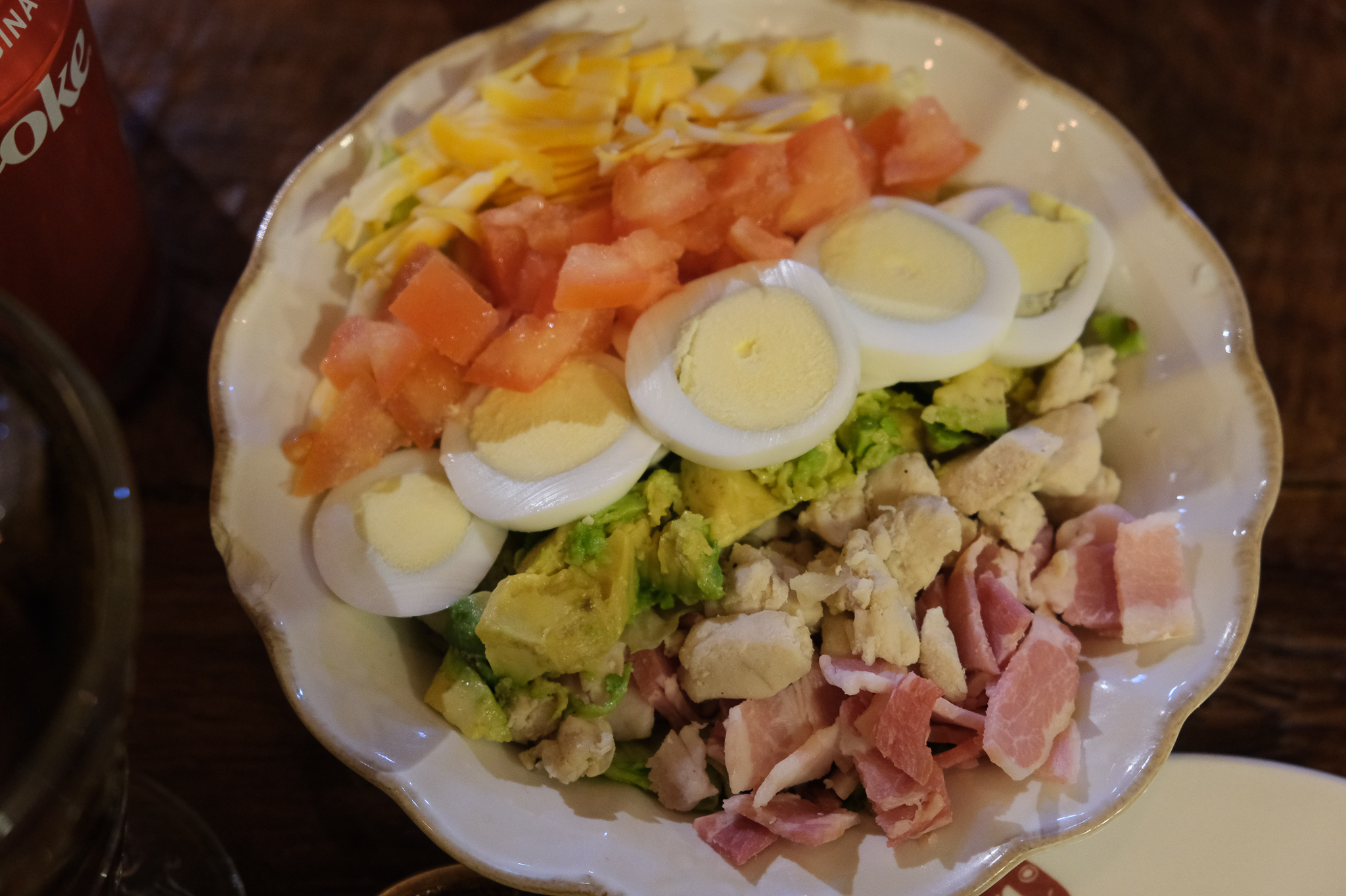 위에는 치즈, 토마토, 달걀, 아보카도, 닭고기, 안익은 베이컨이 있었고 아래는 양상추로 채워져 있었다.