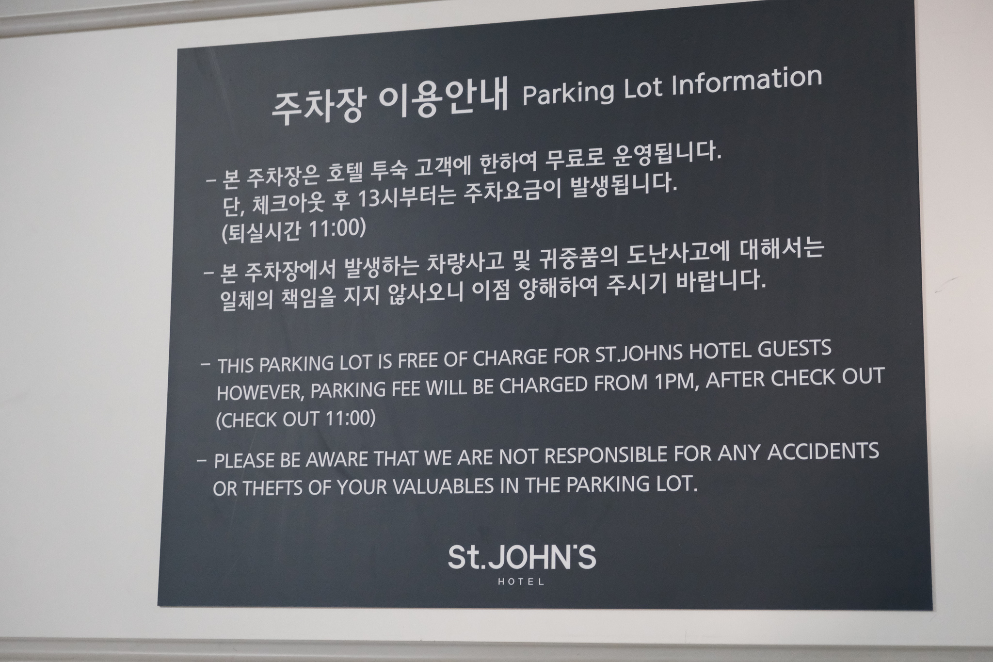 주차장은 투숙 고객에 한하여 무료인데 체크아웃 후에는 주차요금이 발생한다고 되어 있었다.