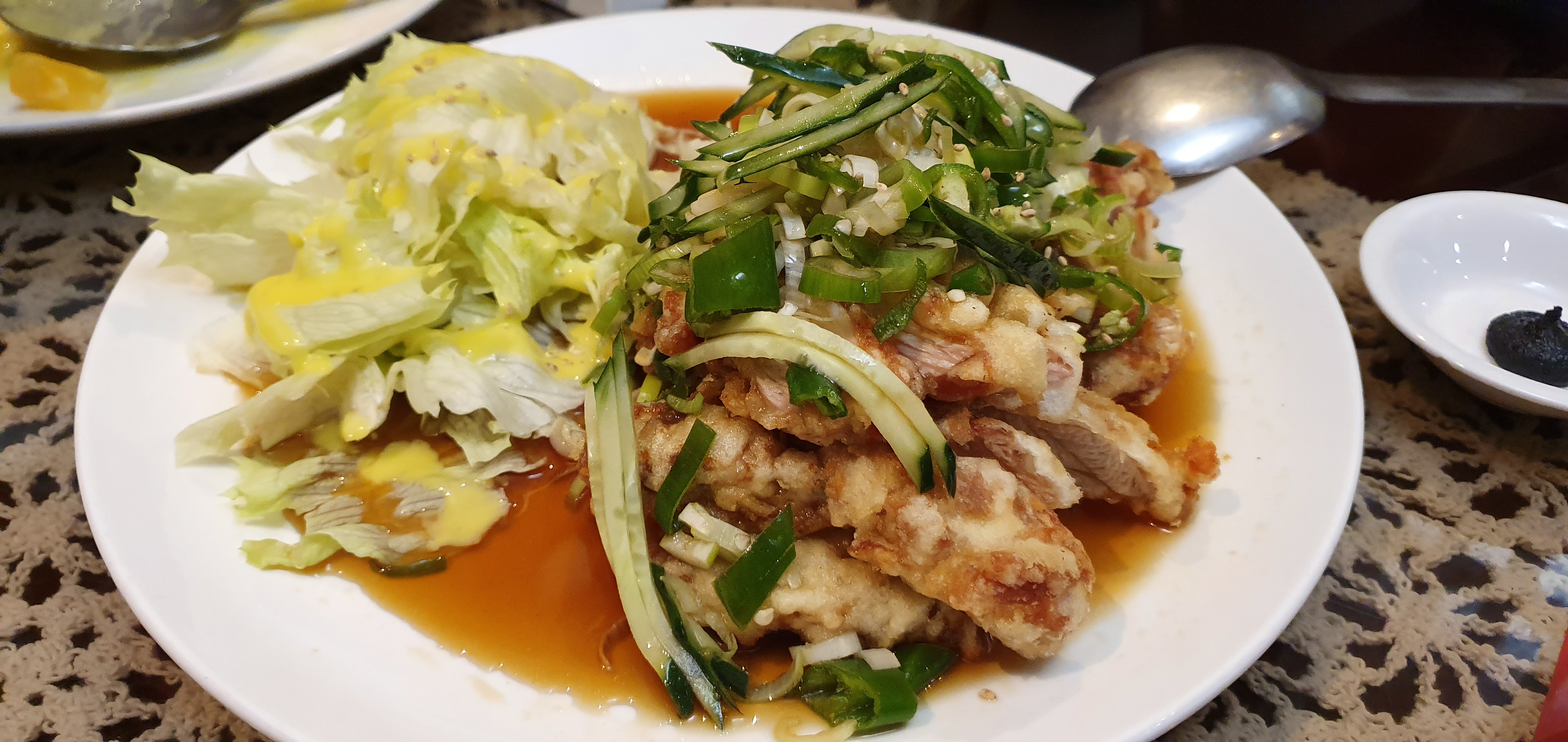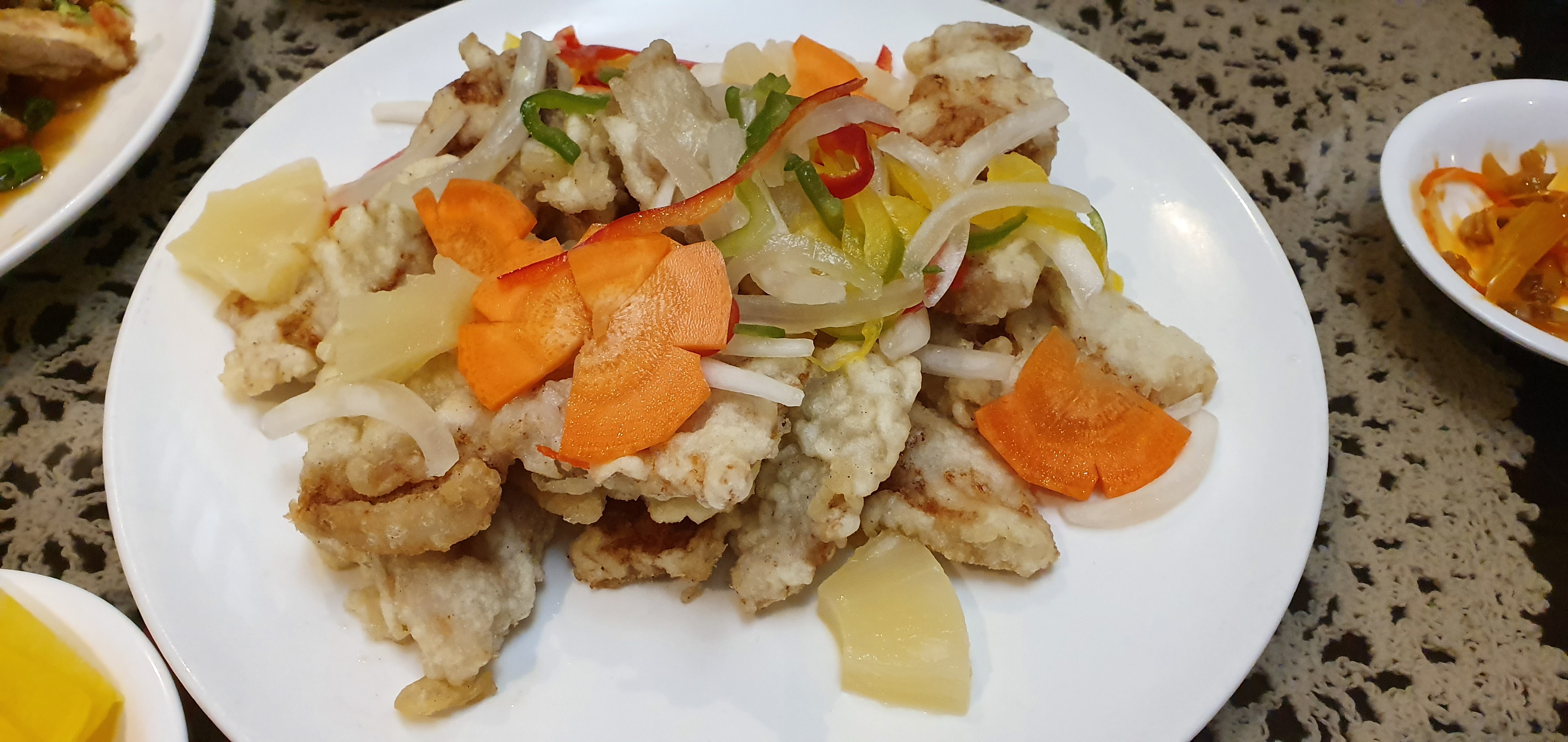 보통 소스에 채소가 들어가 있는데 여기는 탕수육 위에 채소가 있었다.