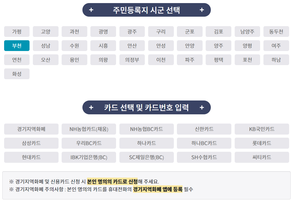 주민등록지 시군을 선택하고 카드 선택 및 카드번호를 입력한다.