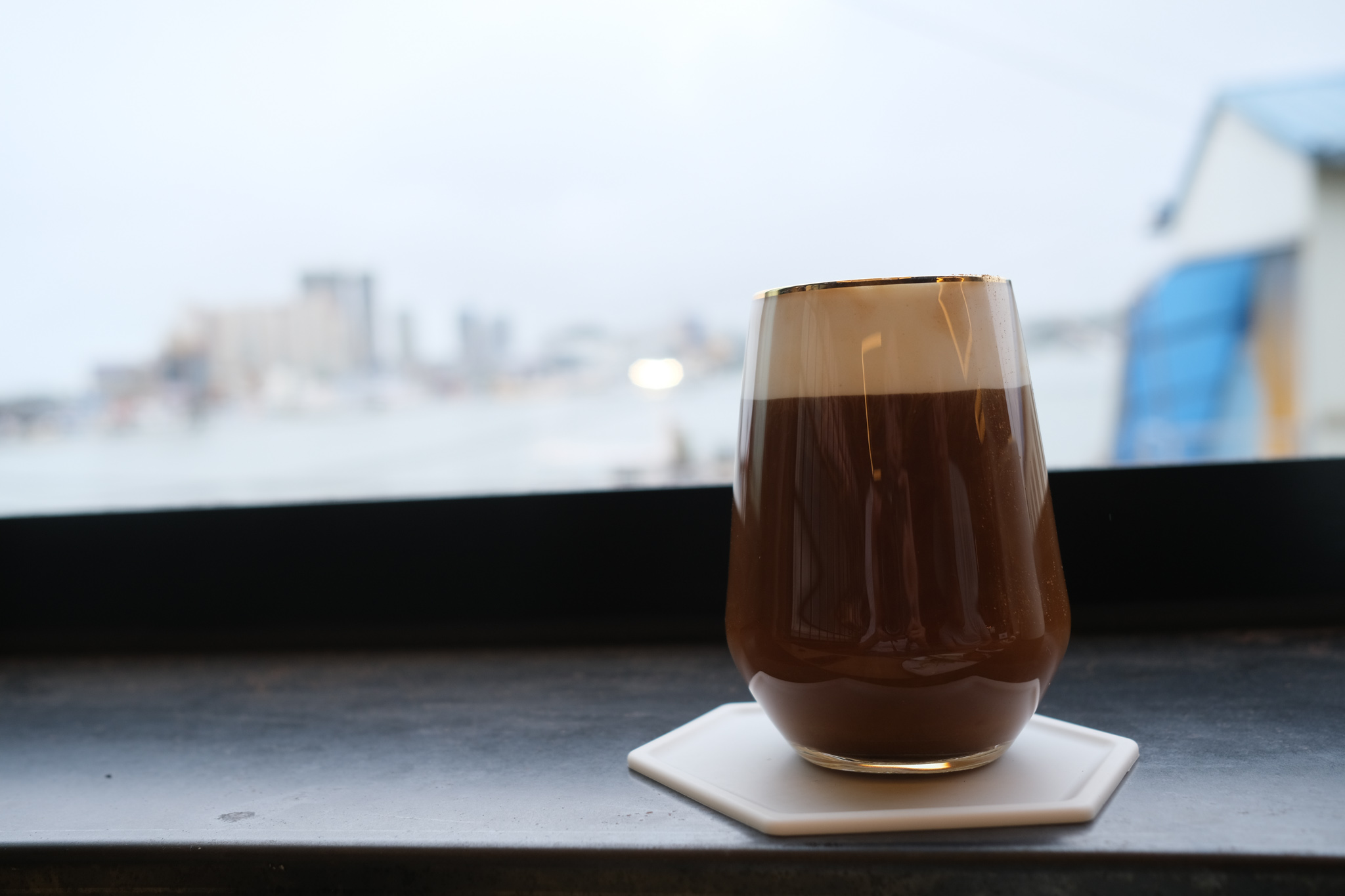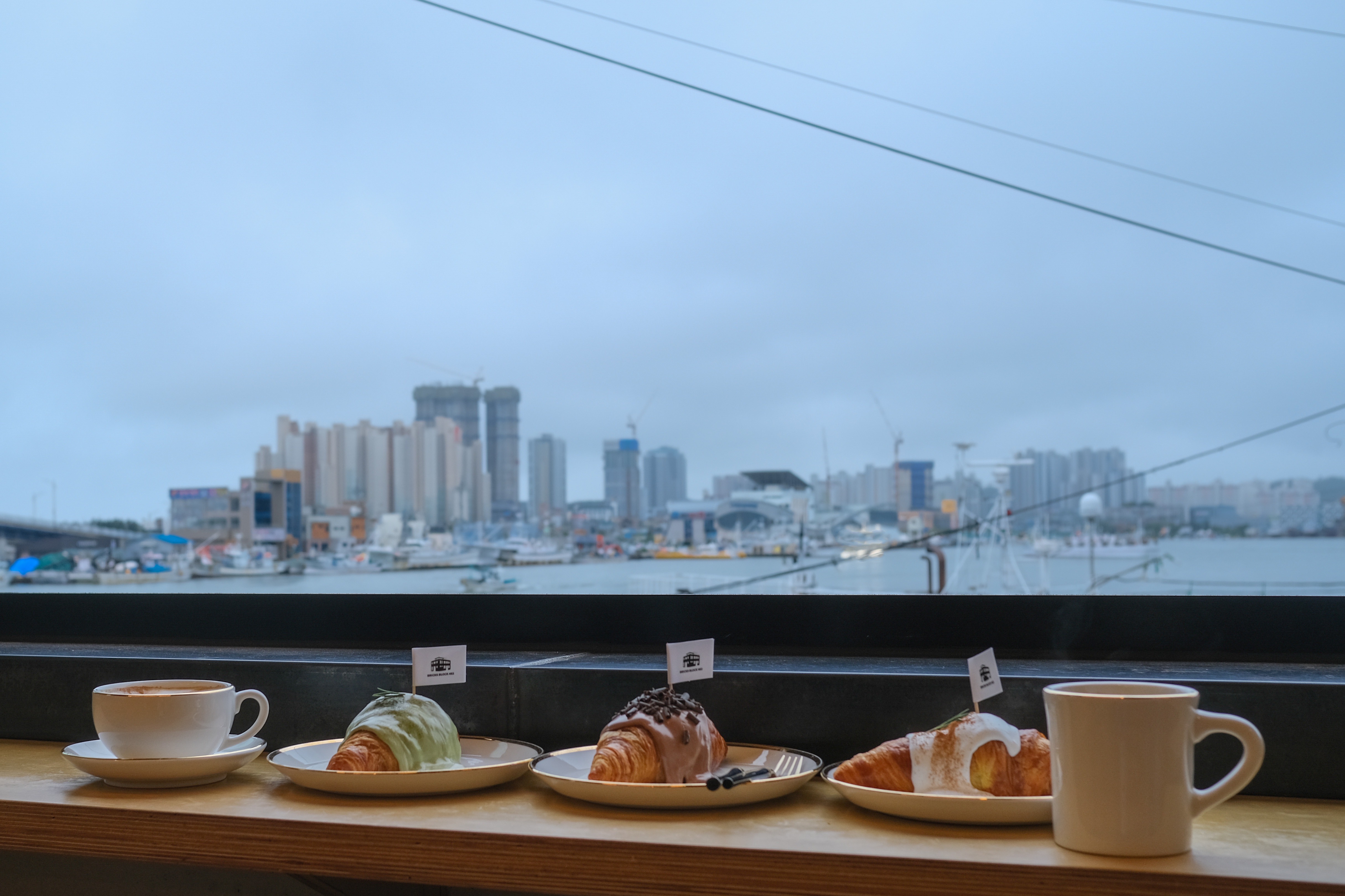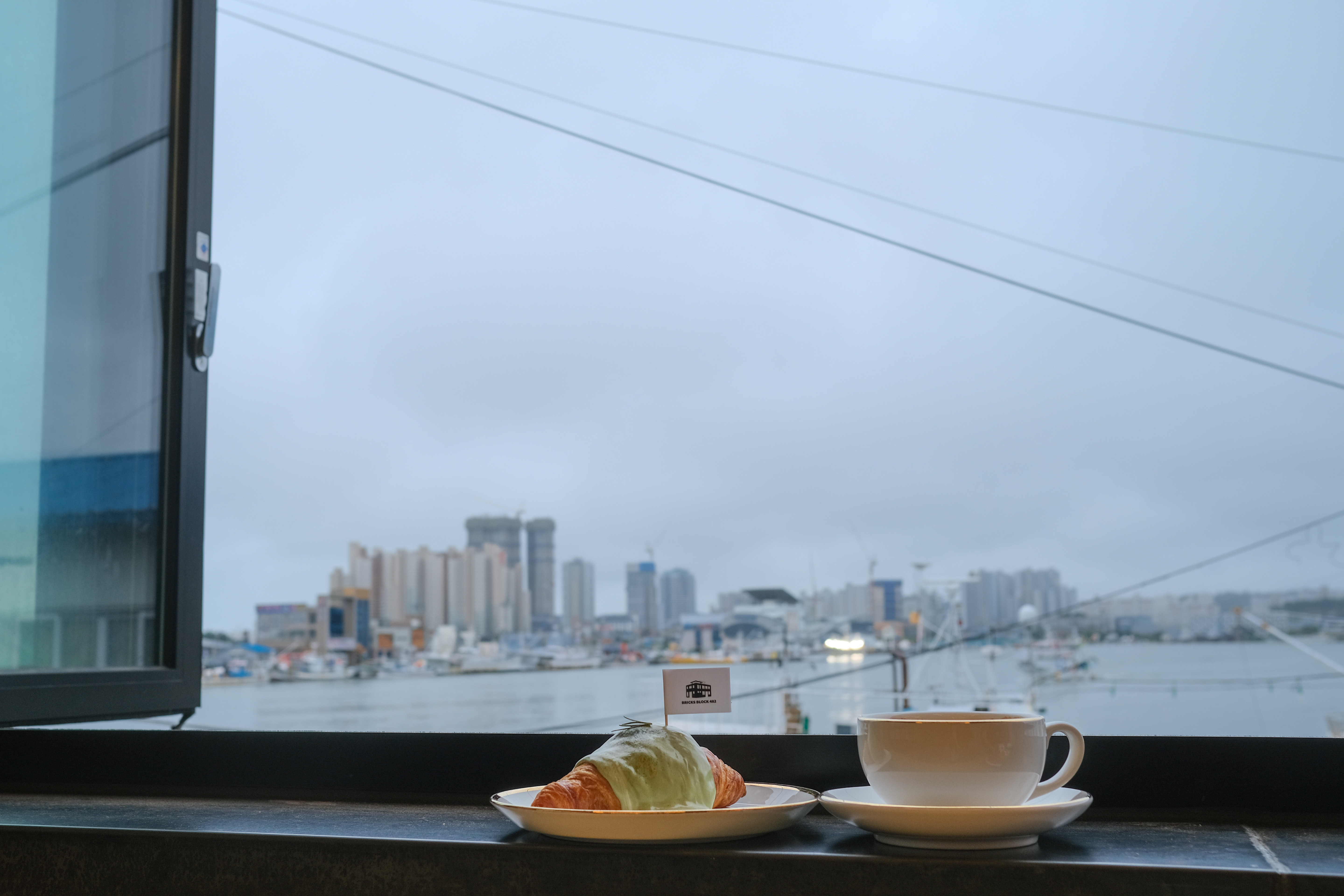 바다가 보이게 창이 열려있었는데 비가 조금 쳐들어왔지만 그래도 창가쪽에 자리를 잡았다.