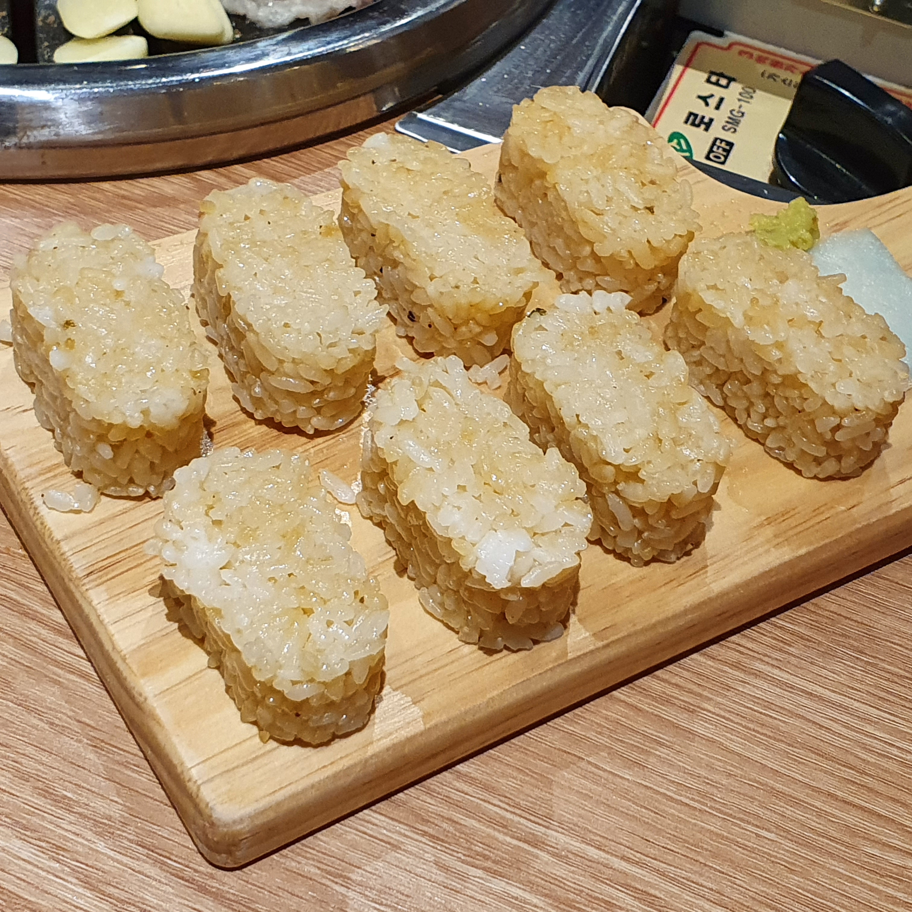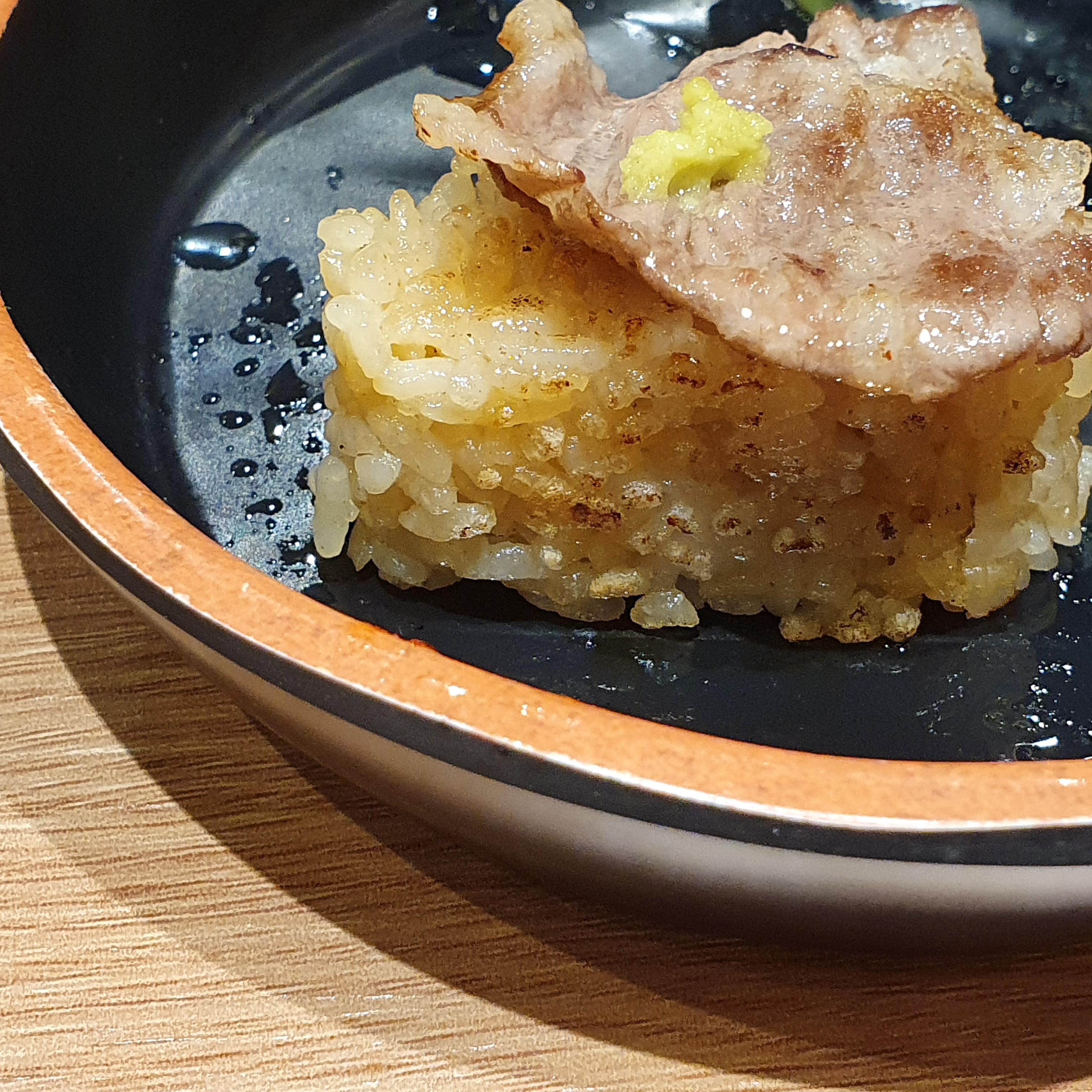 구운밥 위에 고기 올리고 와사비 까지 올려서 먹었는데 맛있었다.