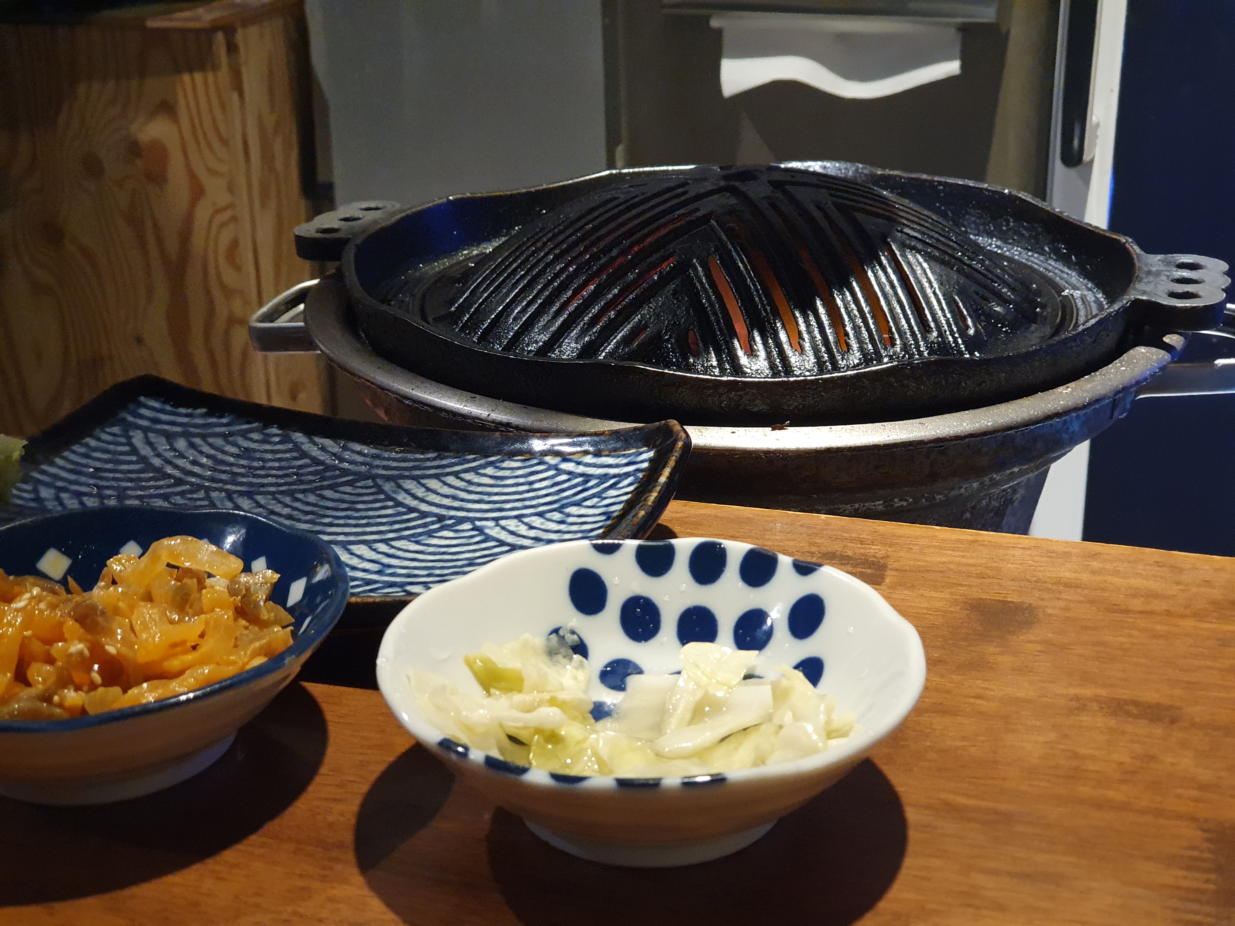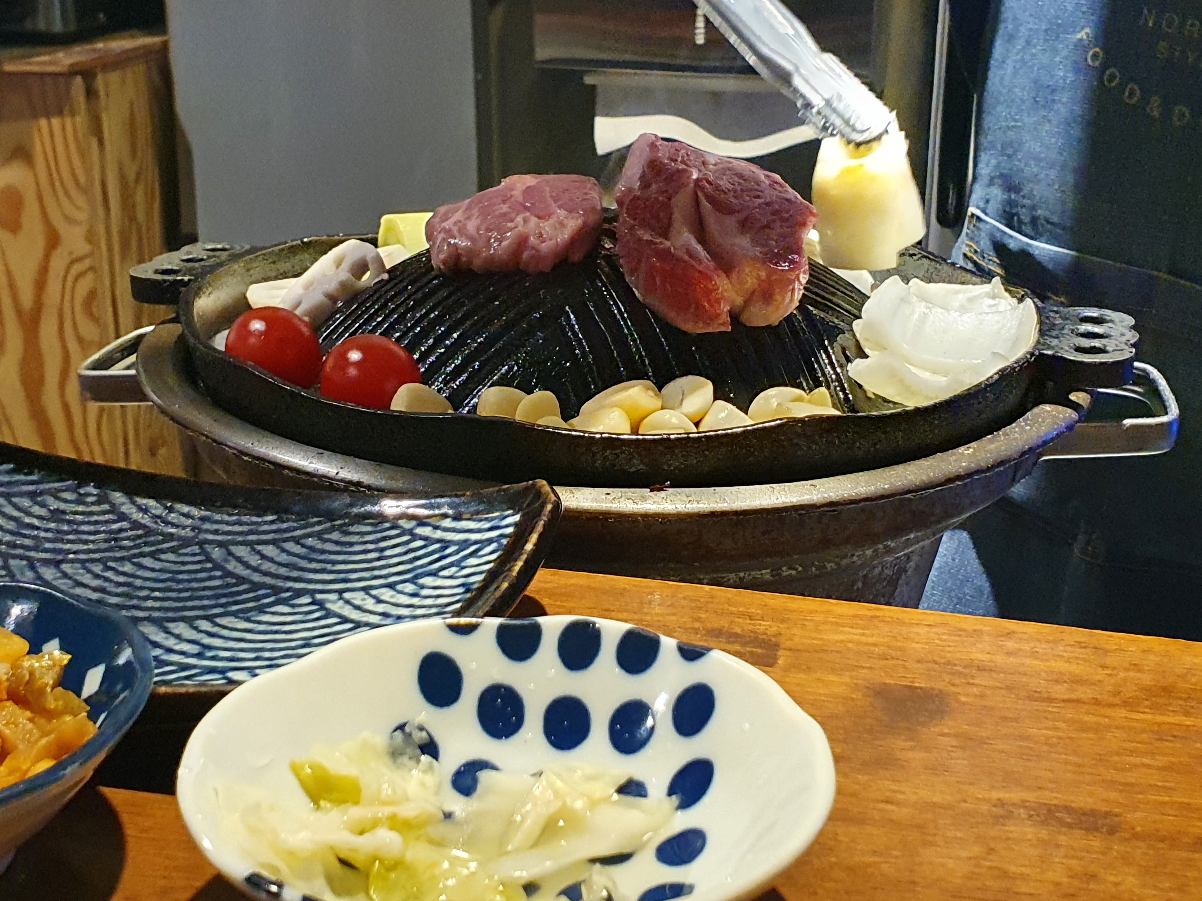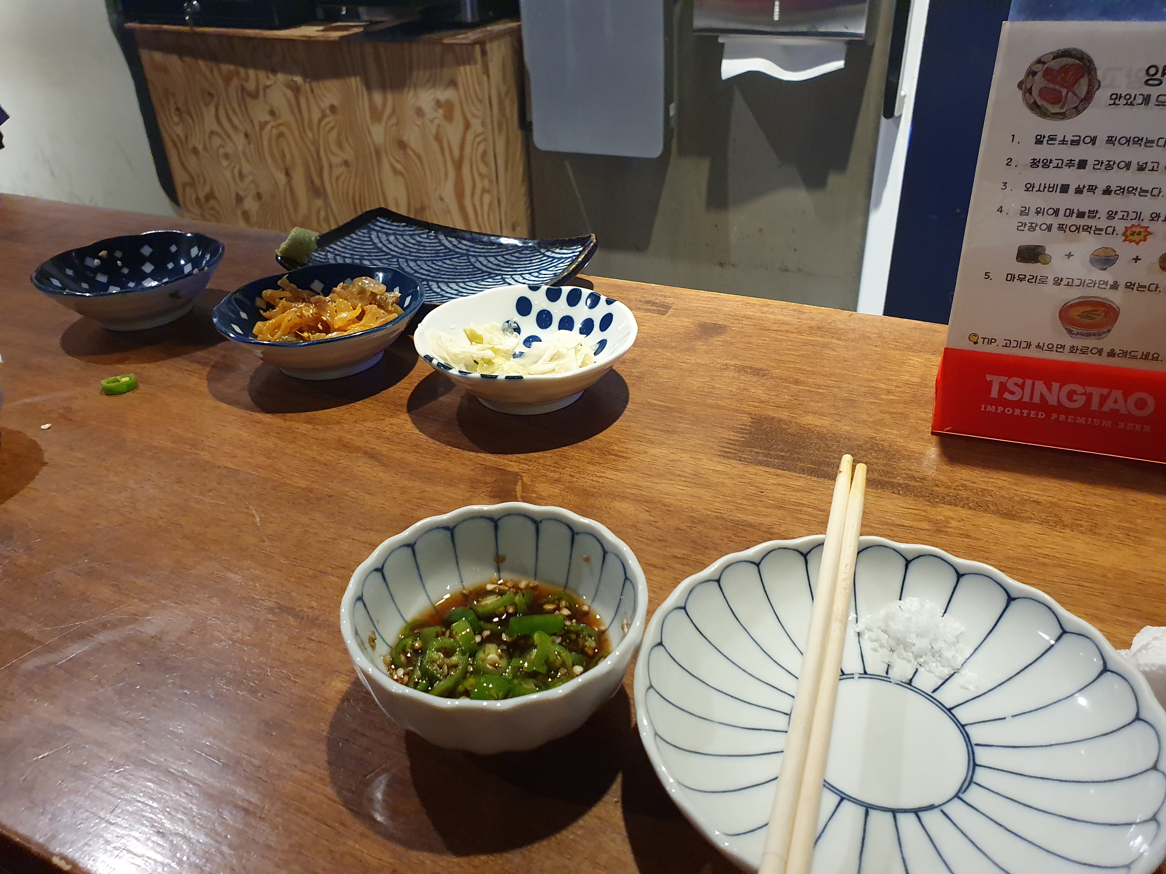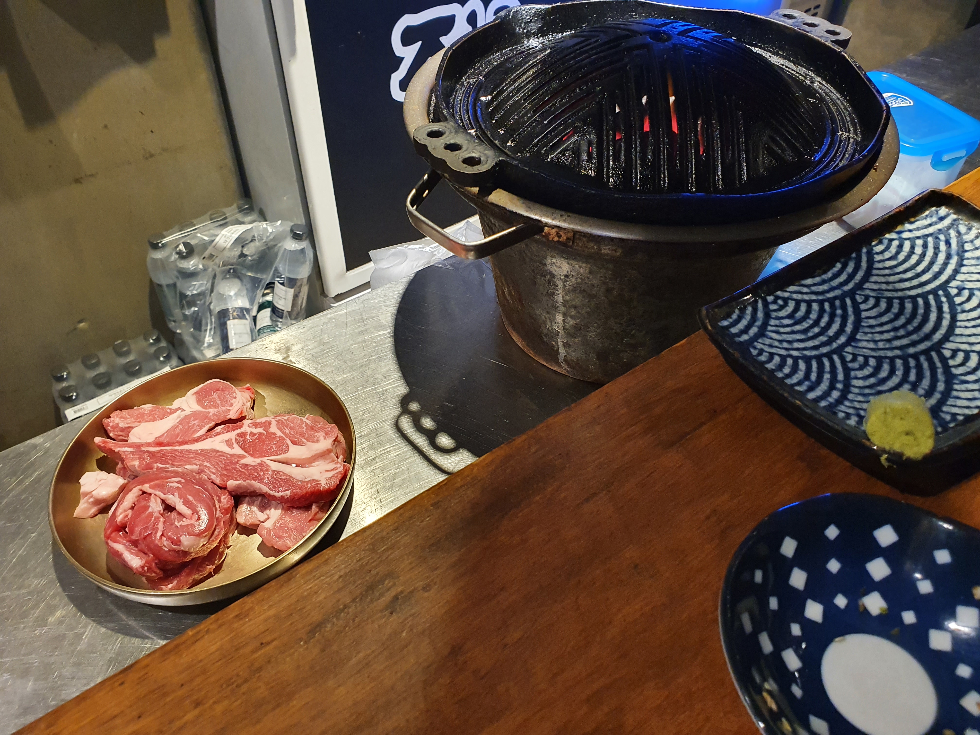 자차이를 조금씩 집어먹는 사이 사장님께서 불판과 고기를 세팅하셨다.