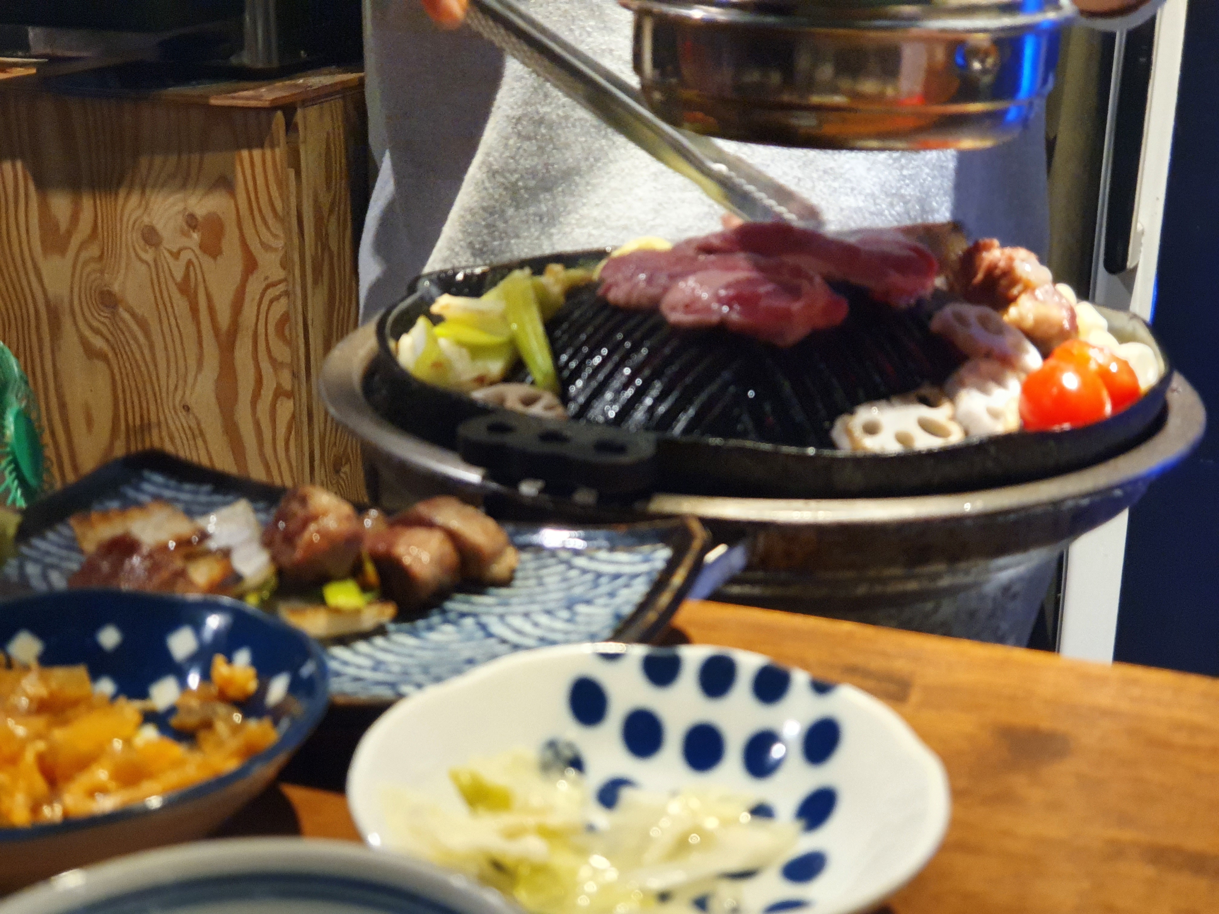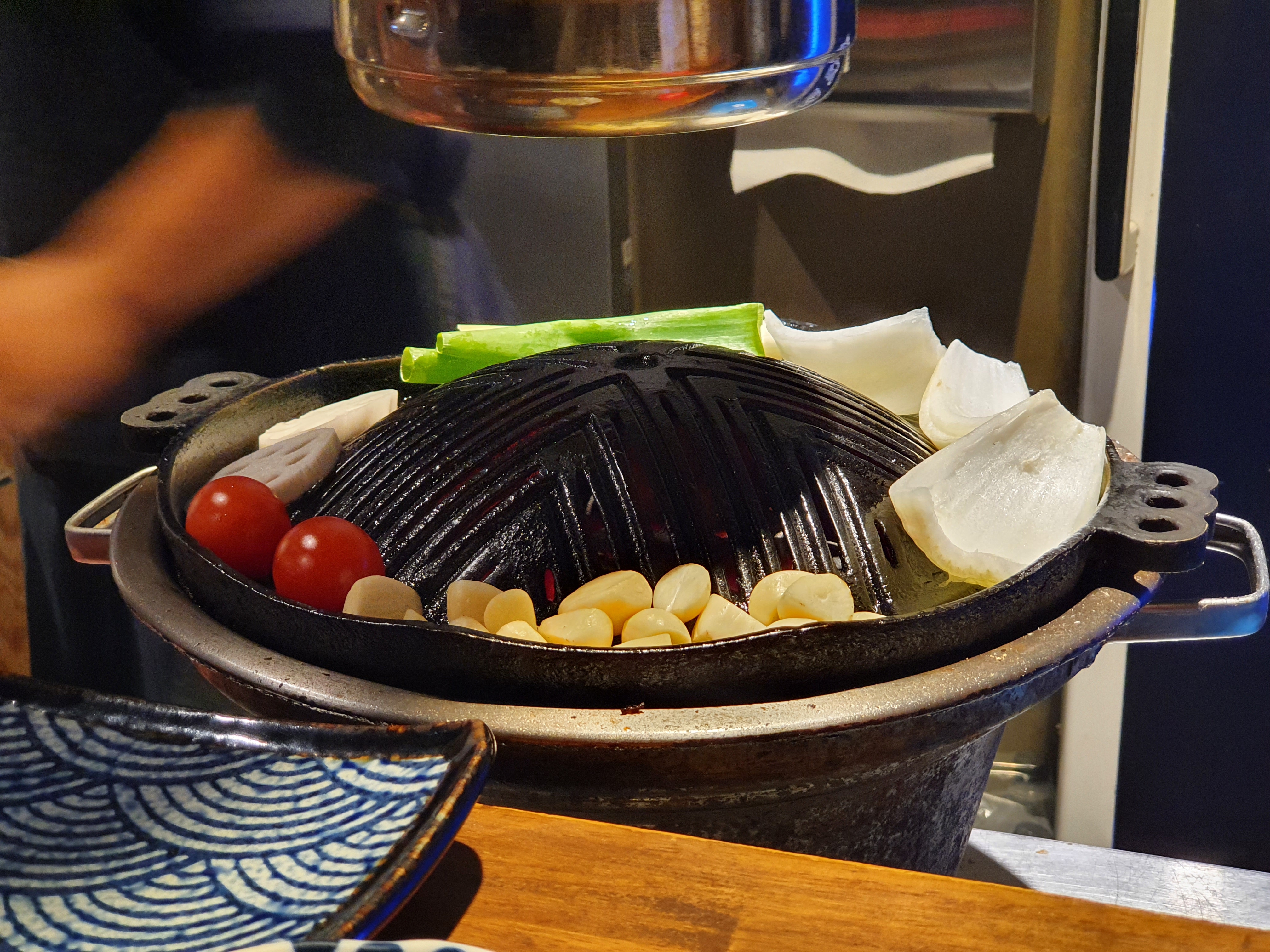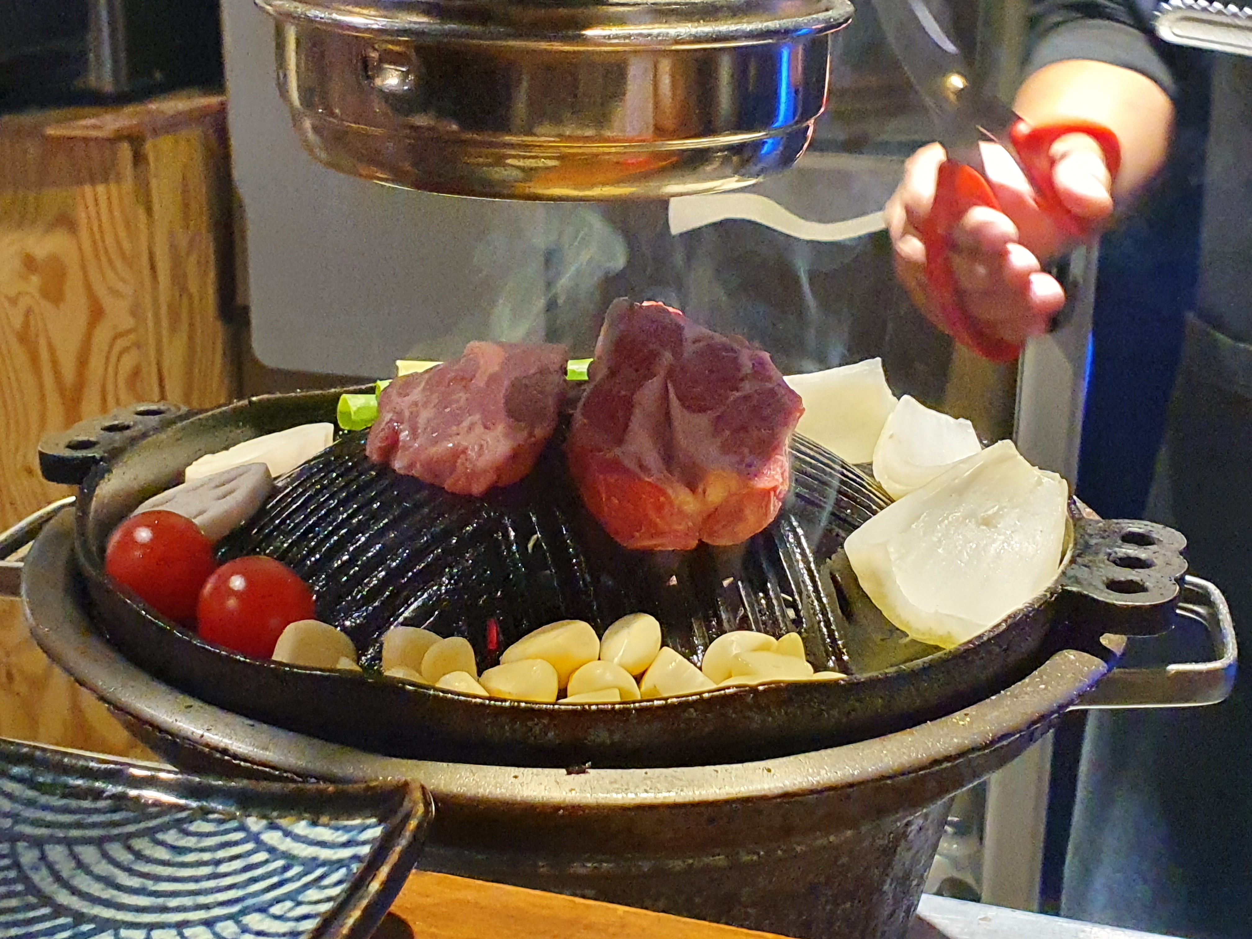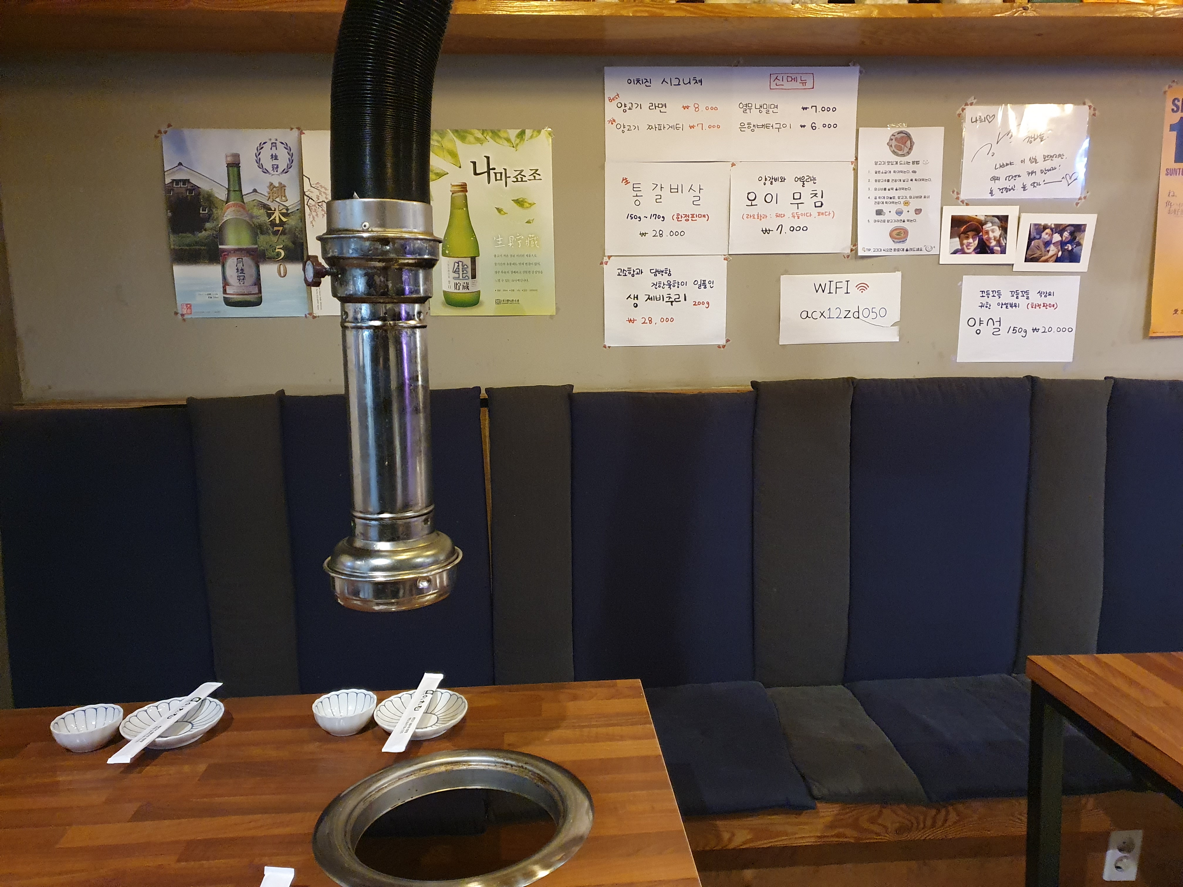 자차이를 조금씩 집어먹는 사이 사장님께서 불판과 고기를 세팅하셨다.