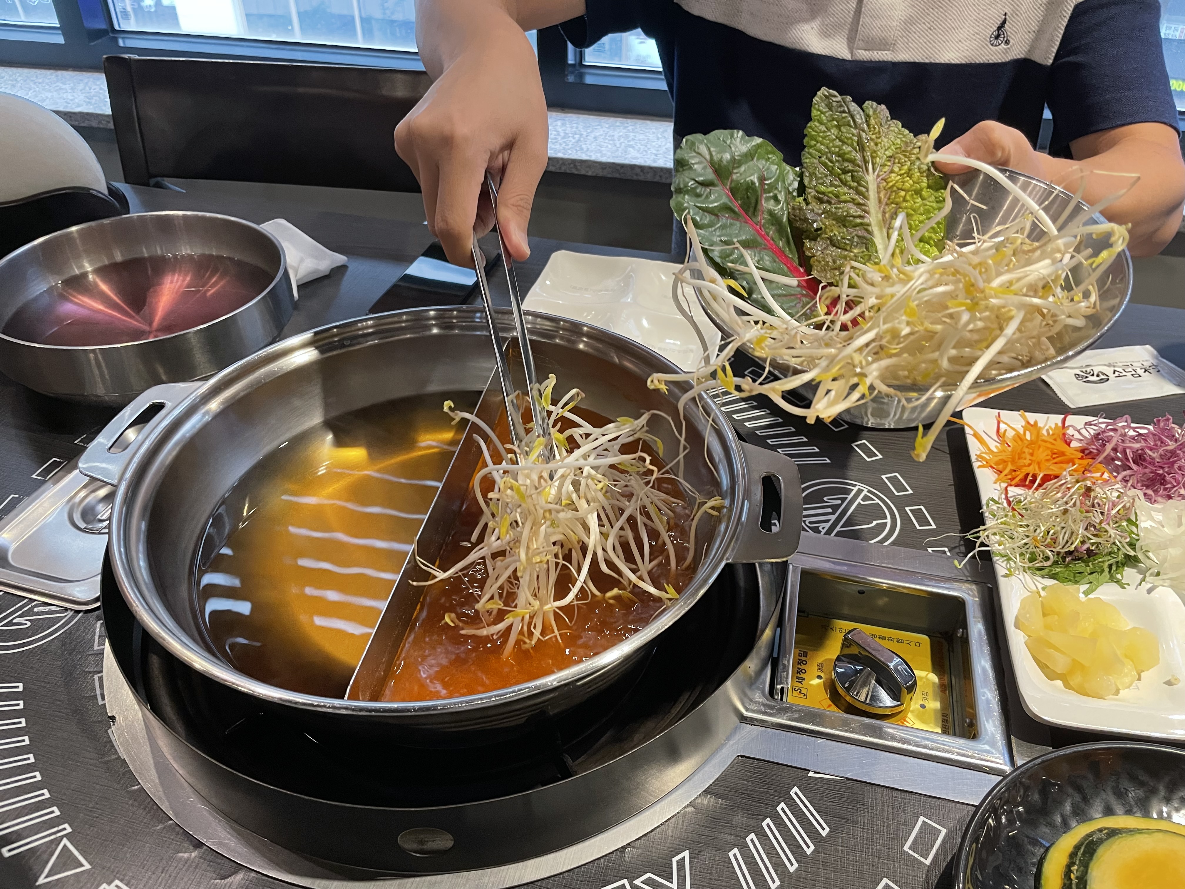 고기는 목살과 양지 반반으로 주문하고 국물은 순한맛과 매운맛 반반으로 했다.