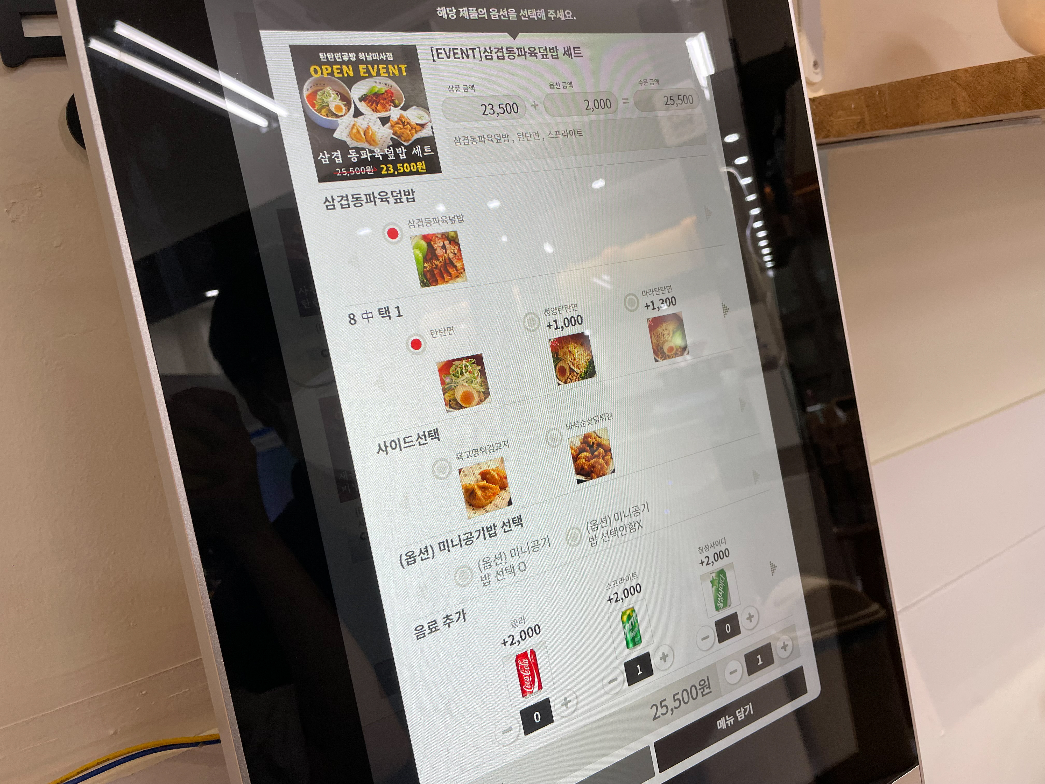 우리는 삽겹동파육덮밥 세트(삼겹동파육덮밥+탄탄면+바삭순살닭튀김)에 스프라이트를 추가해서 주문했다.