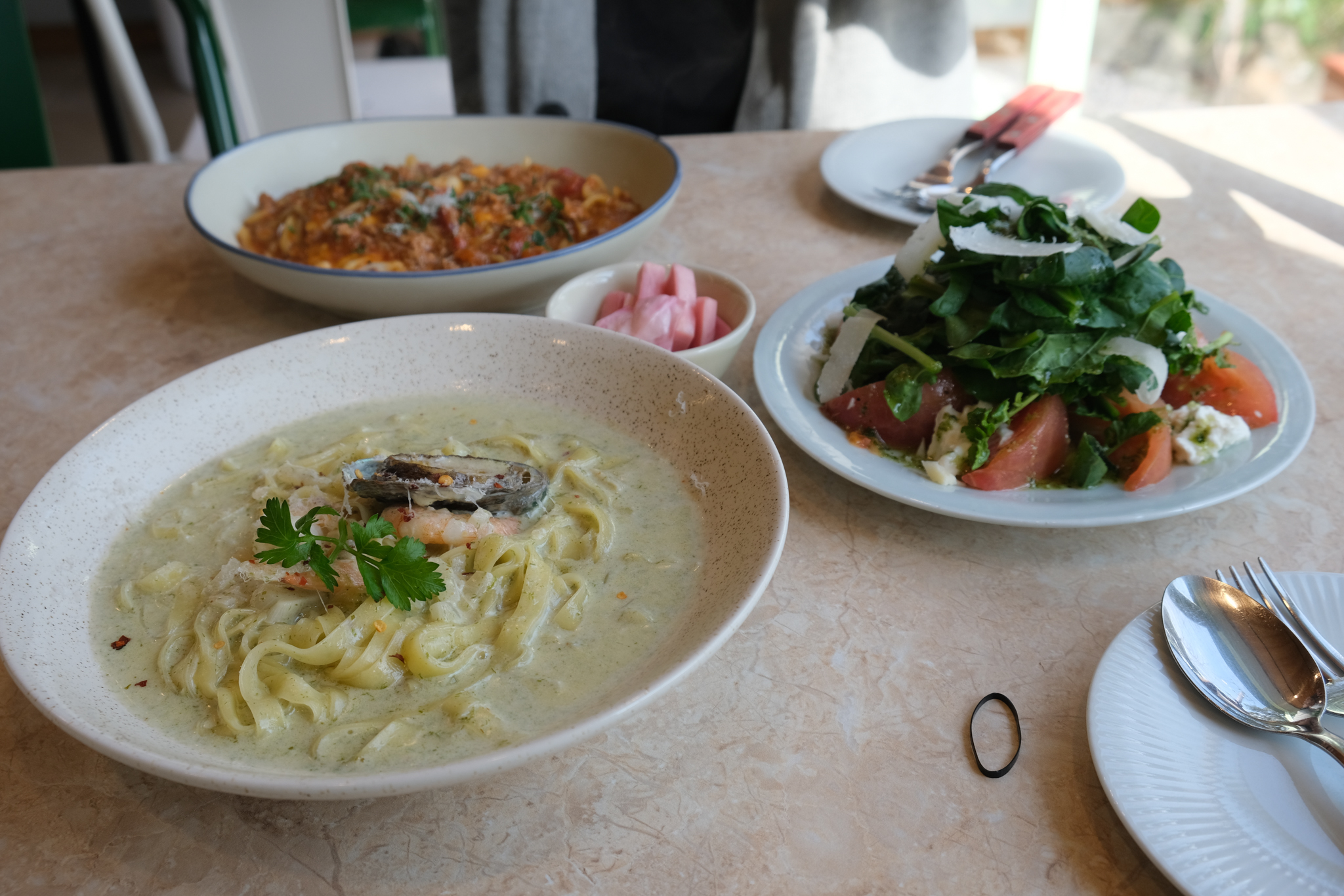 토마토부라타치즈샐러드, 감태페스토 파스타, 흑돼지 라구 파스타 하나씩 주문했다.