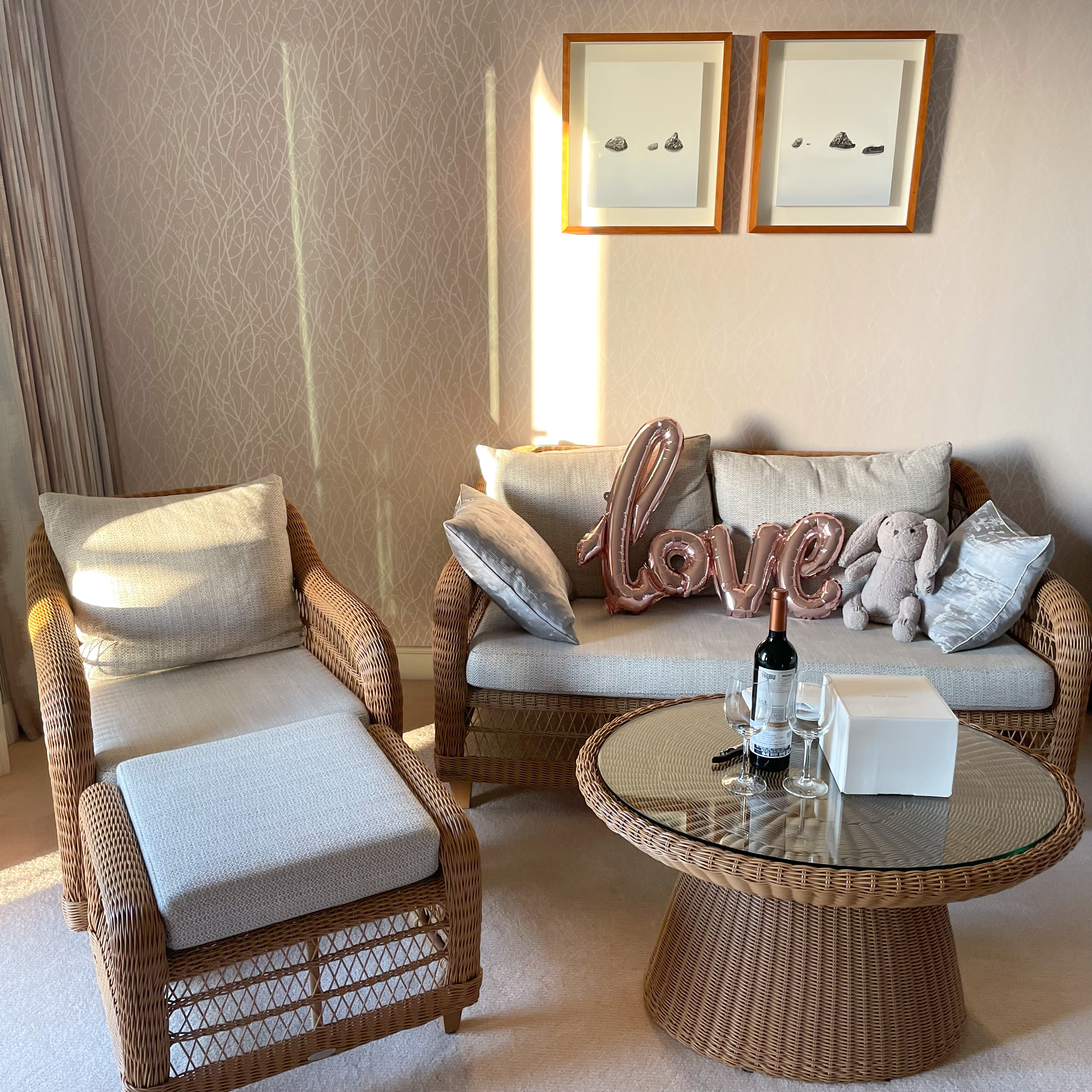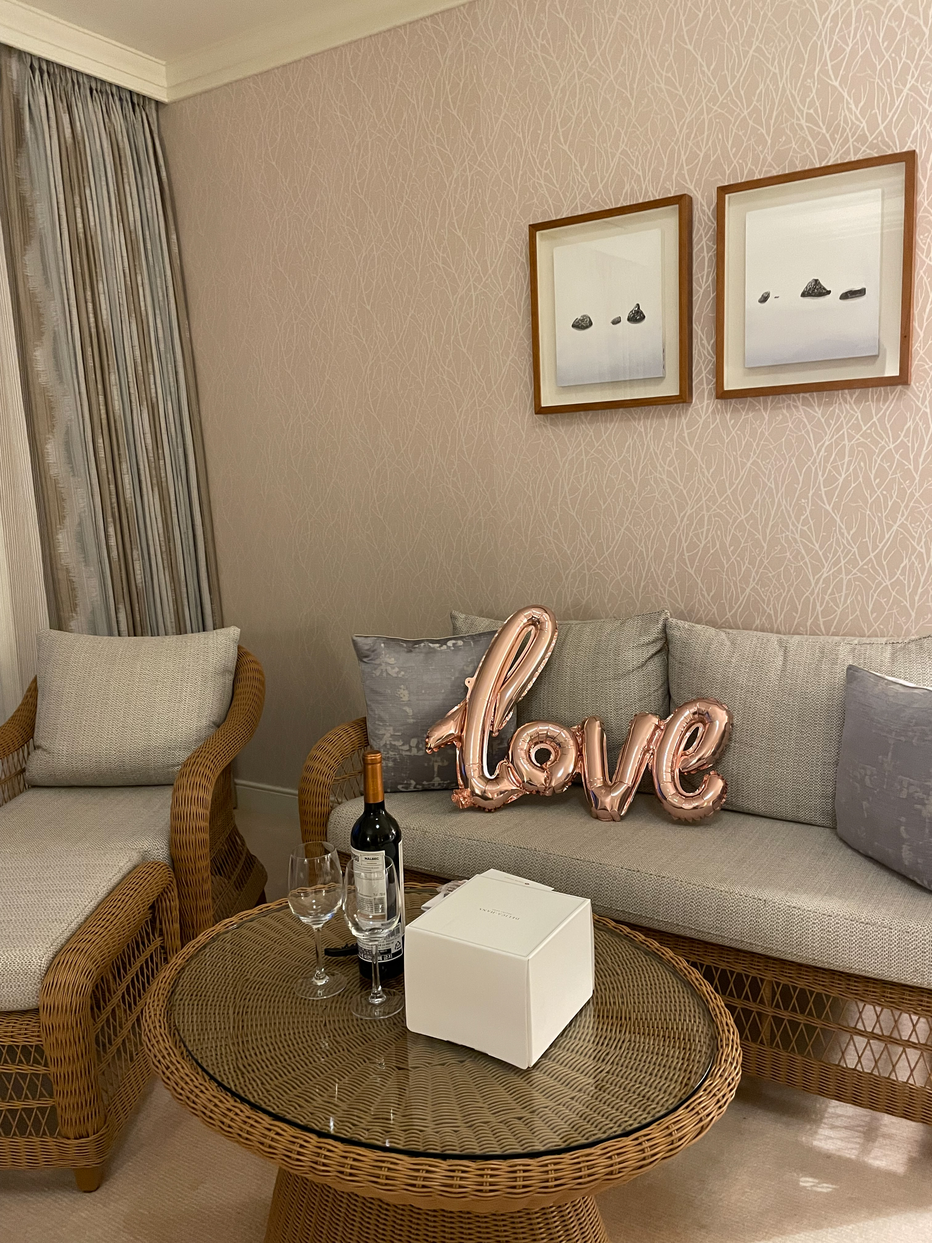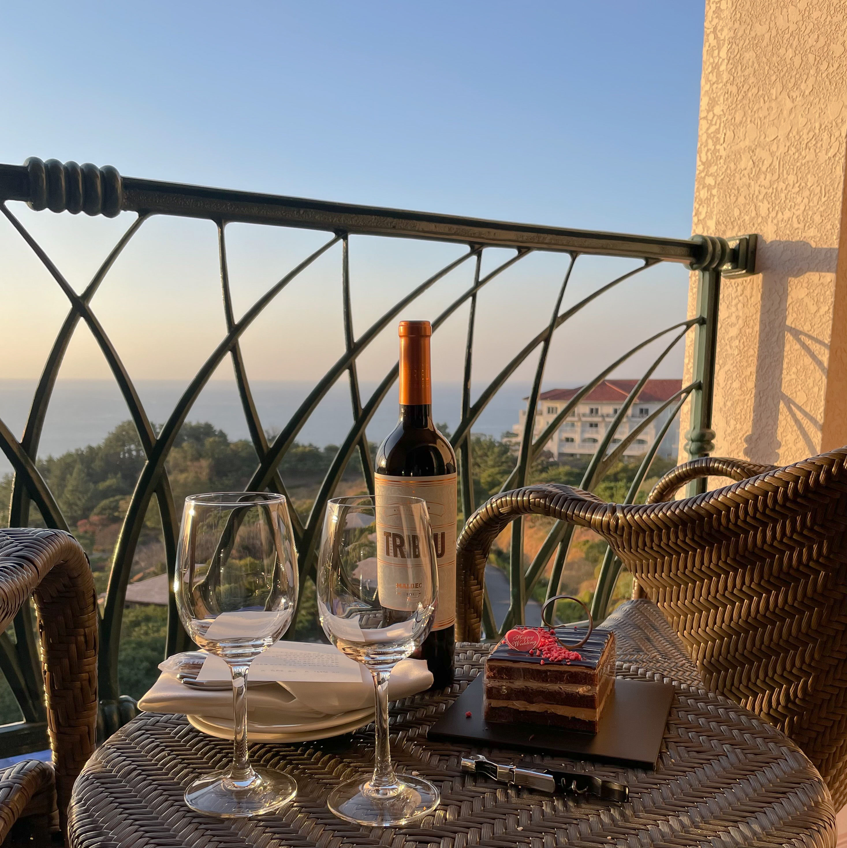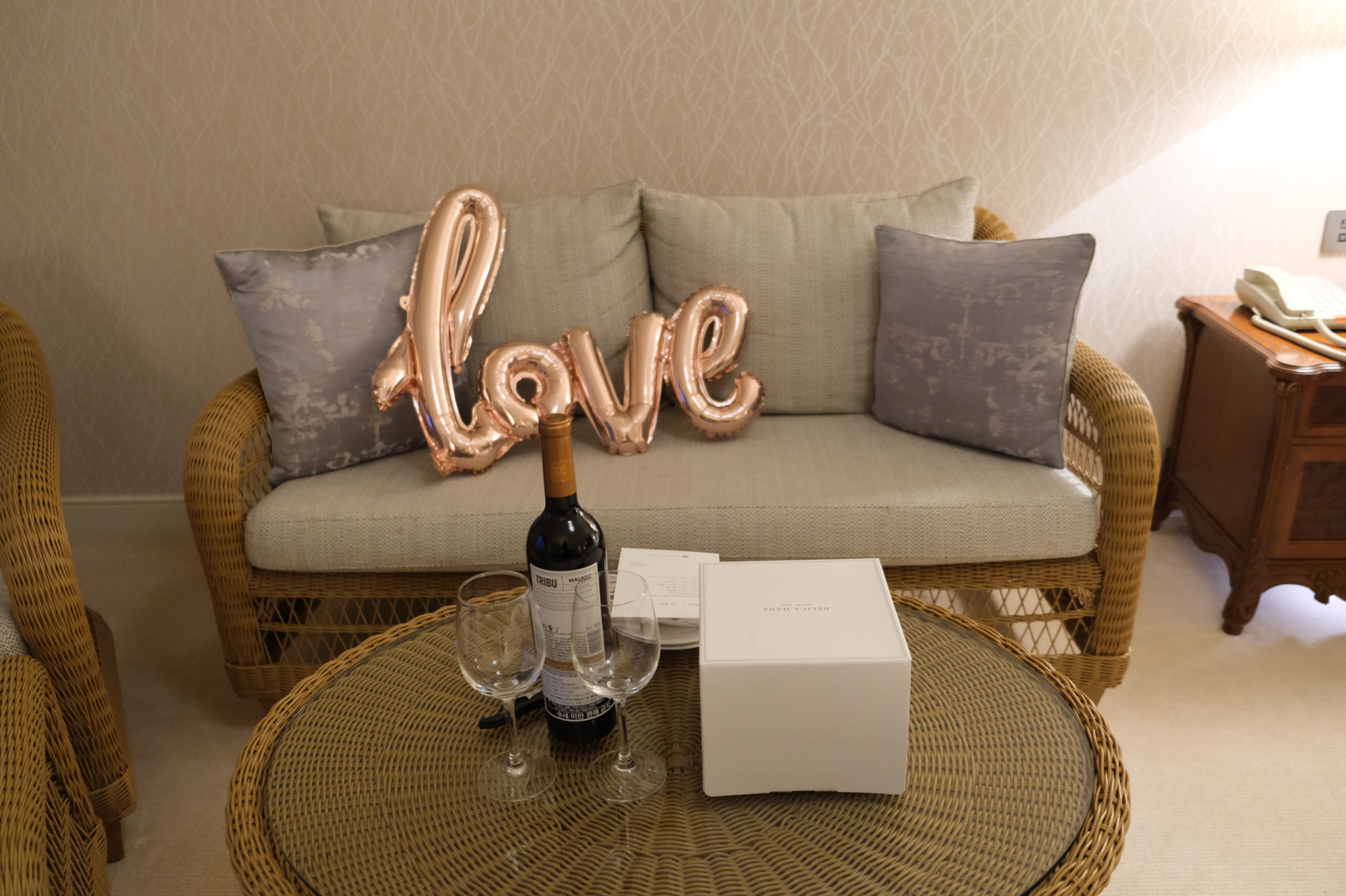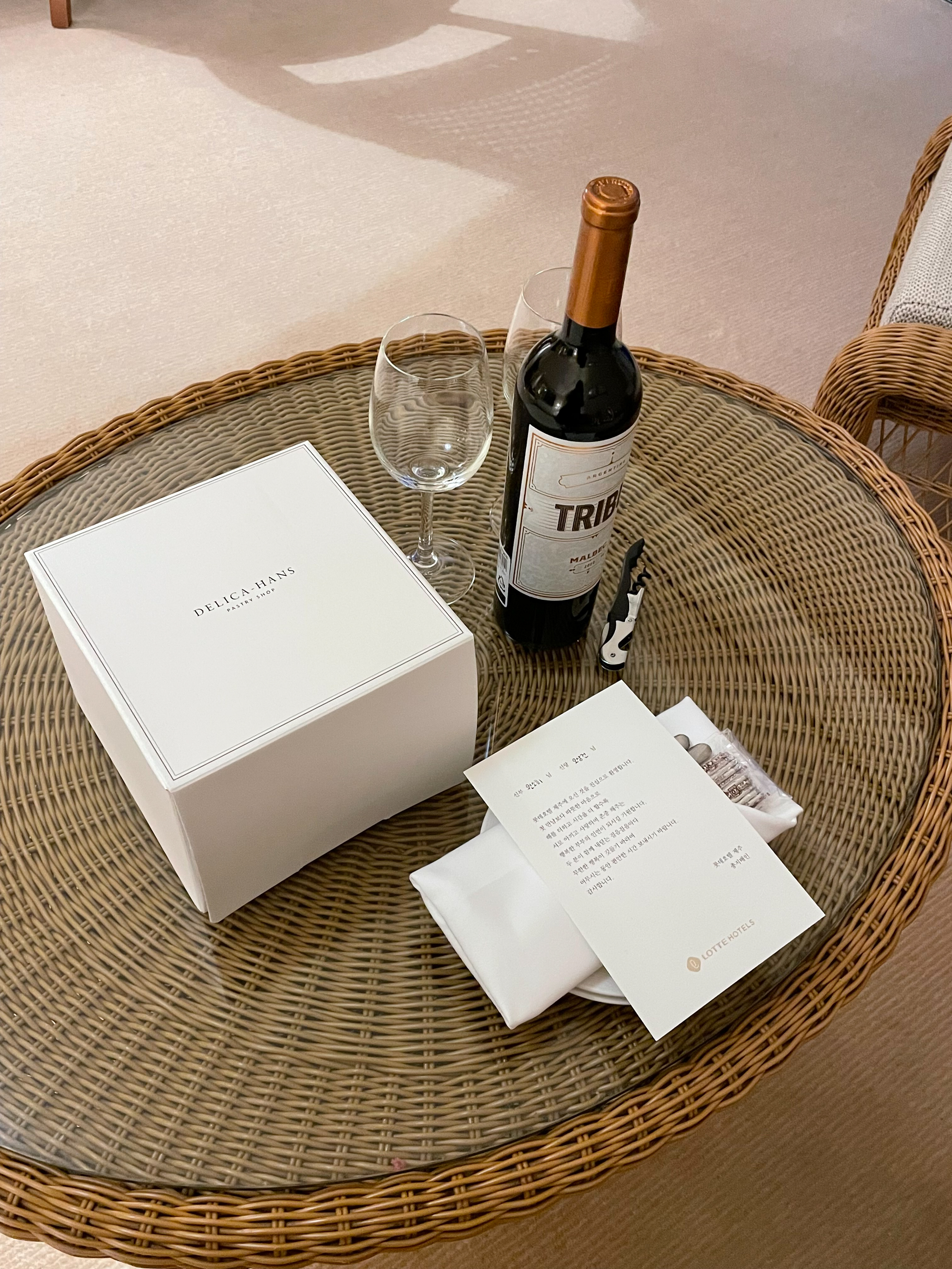 테이블 위에 웰컴 케이크와 와인이 준비되어 있었다.