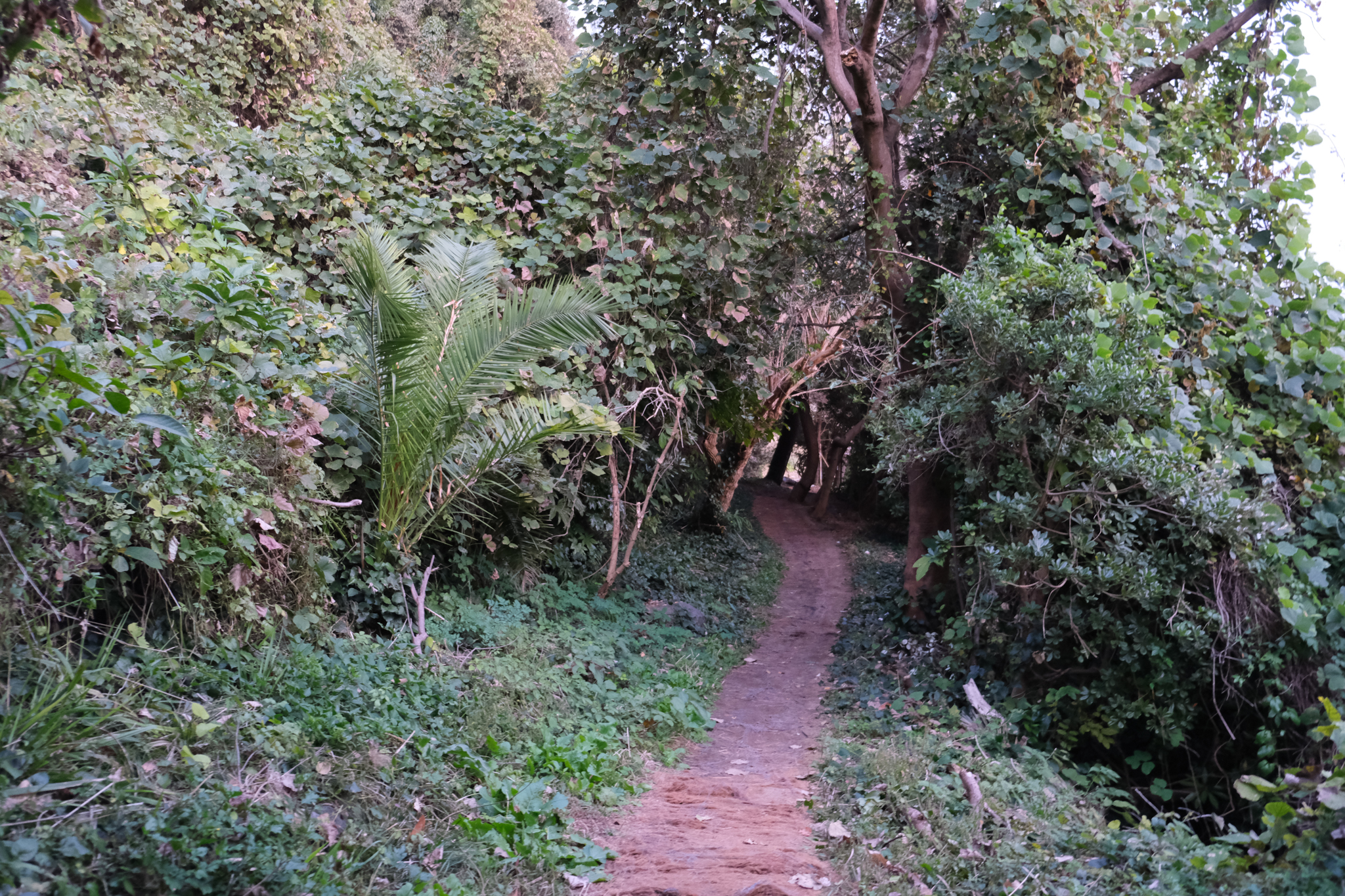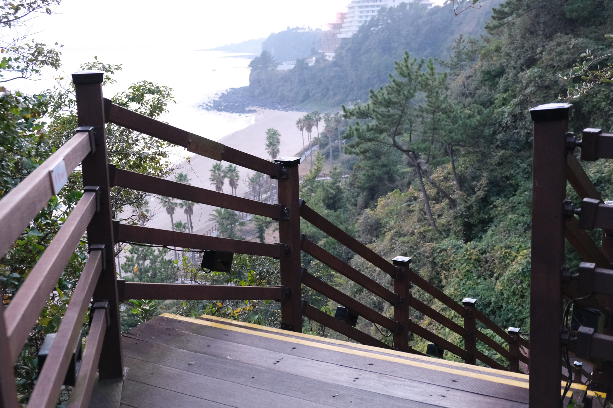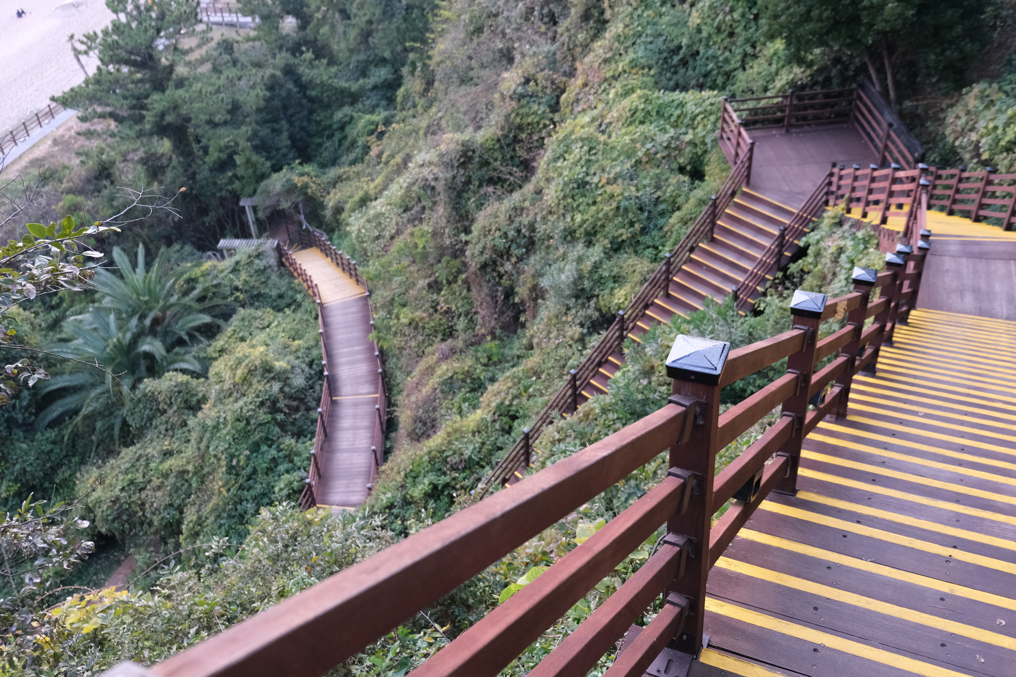 계단을 지나 숲속길을 걸으면 오래지 않아 해수욕장 모래를 밟을 수 있었다.