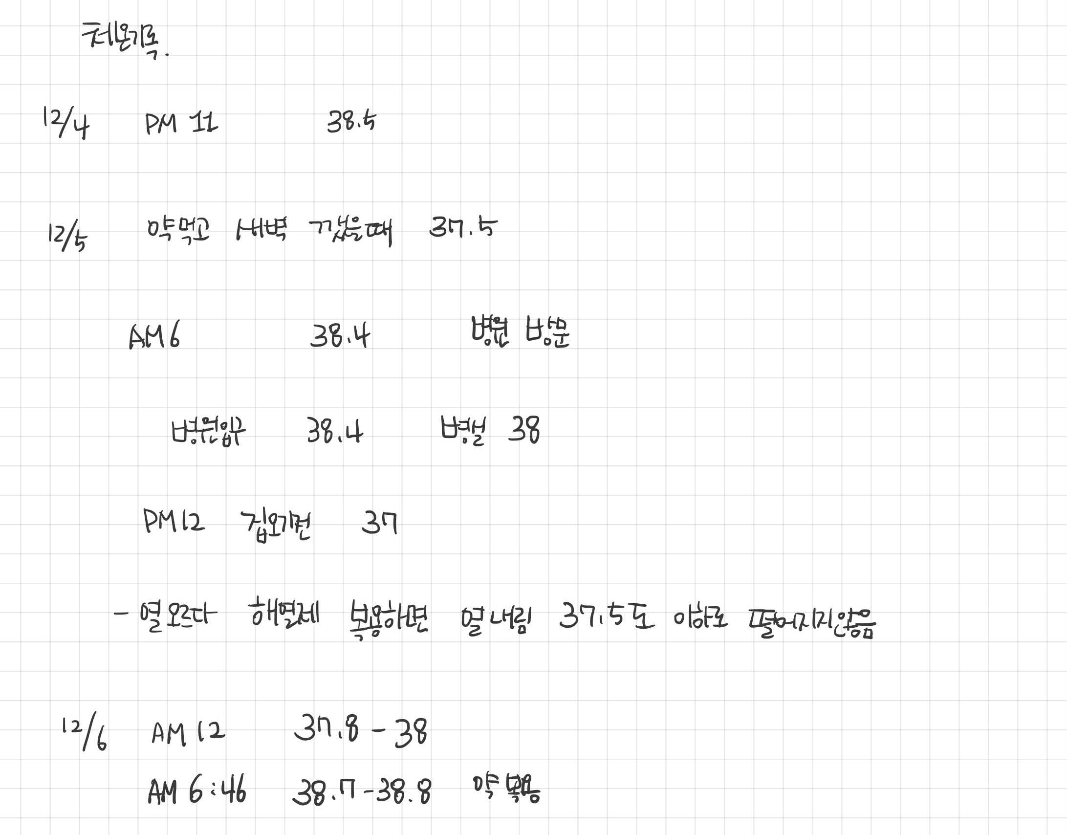- 밤 11시 몸살느낌과 함께 오한이 시작되어 열을 쟀더니 38.5도였다. (타이레놀을 첫 복용했다.)