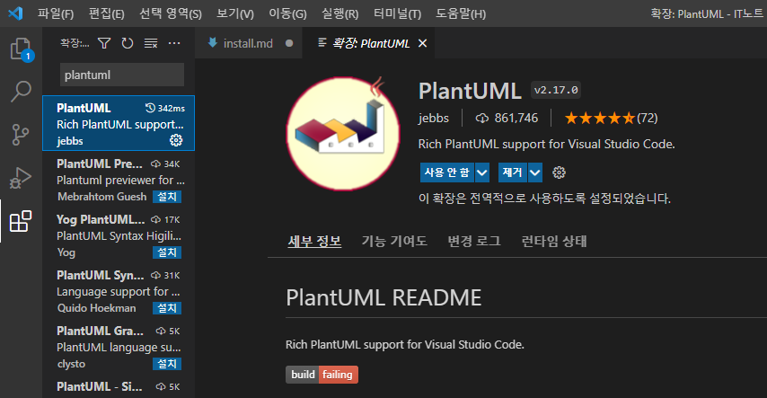 - 일반적인 Extension 설치와 마찬가지로 PlantUML을 검색하고 설치한다.