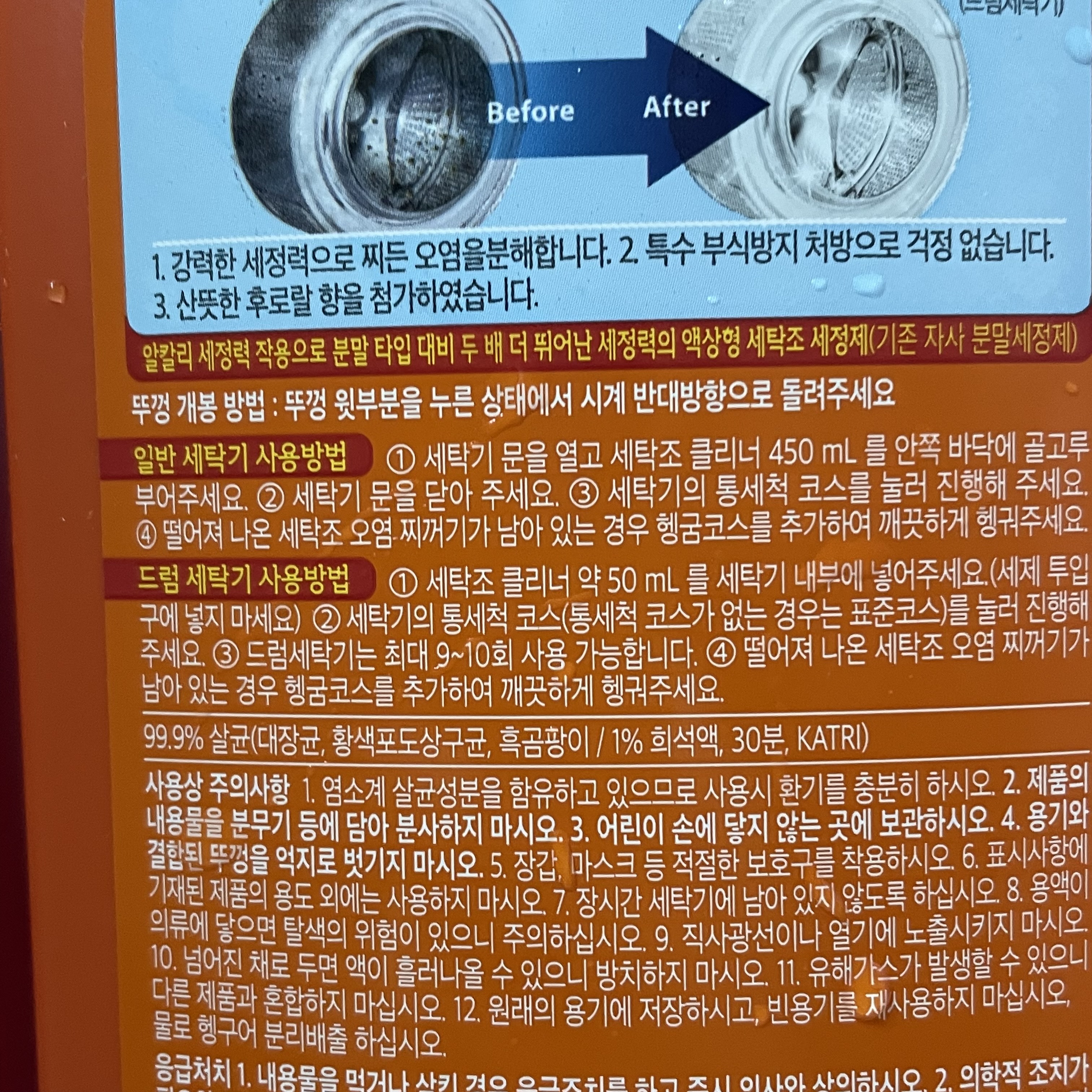 세탁기 바닥에 뿌려주고 통살균 코스를 눌렀다.