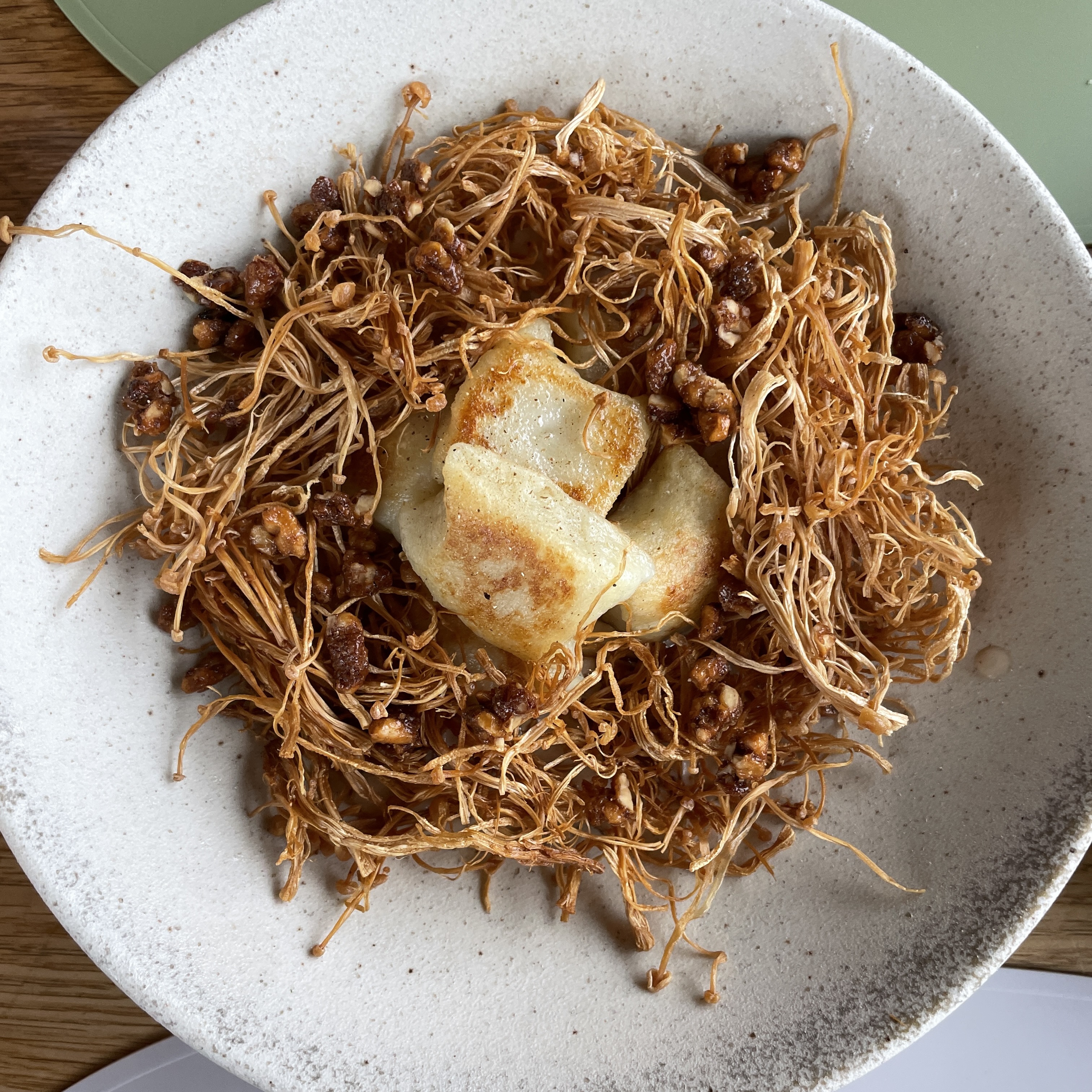 감자 뇨끼에 팽이버섯 튀긴것이 둘러싸고 있었다.