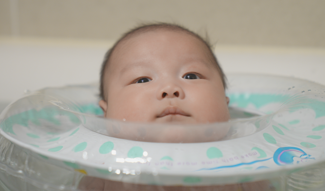 욕조에 물을 담고 울 애기 목튜브 끼워서