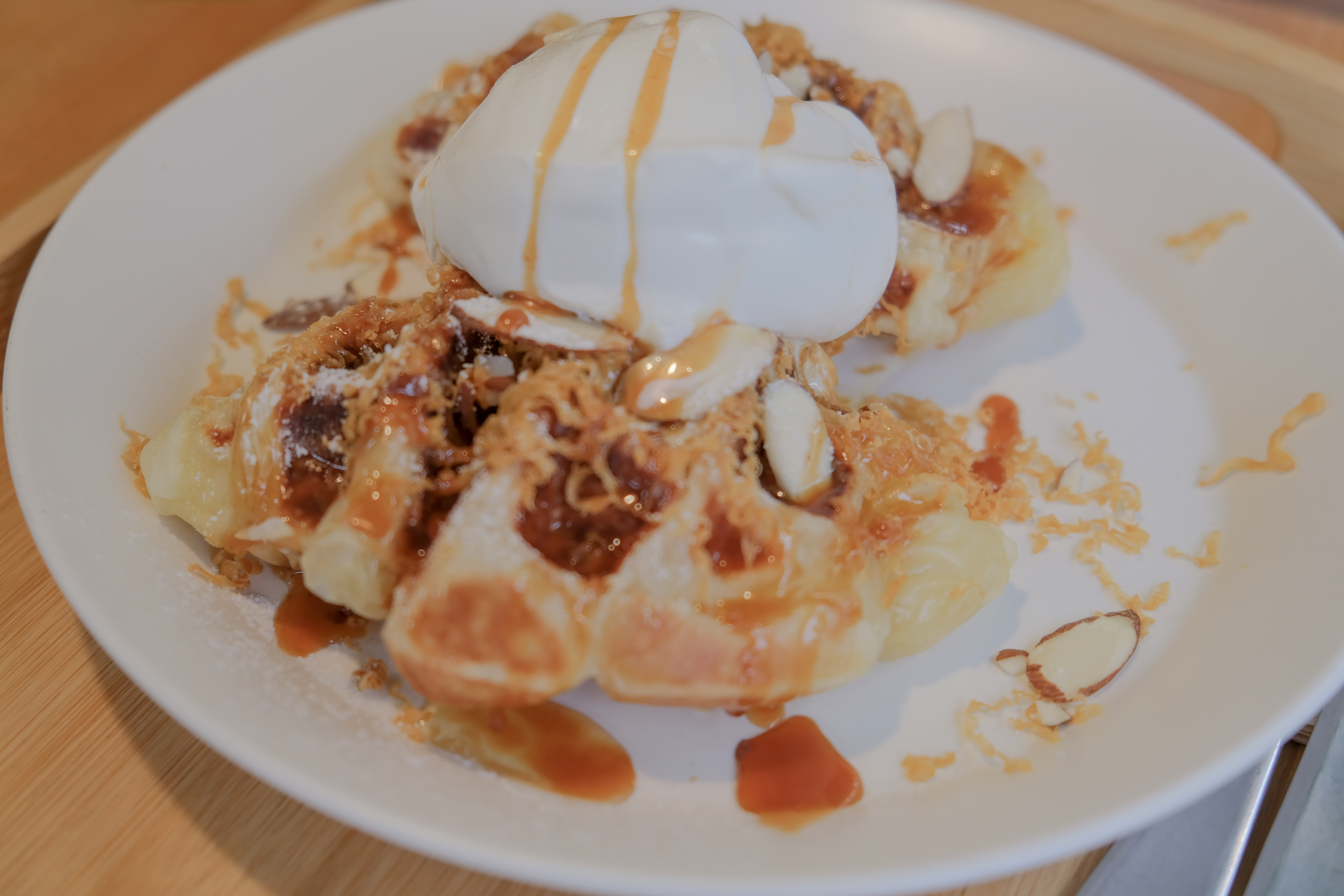 그리고 크로플 위에 올라간 갈색 치즈가 크로플 맛을