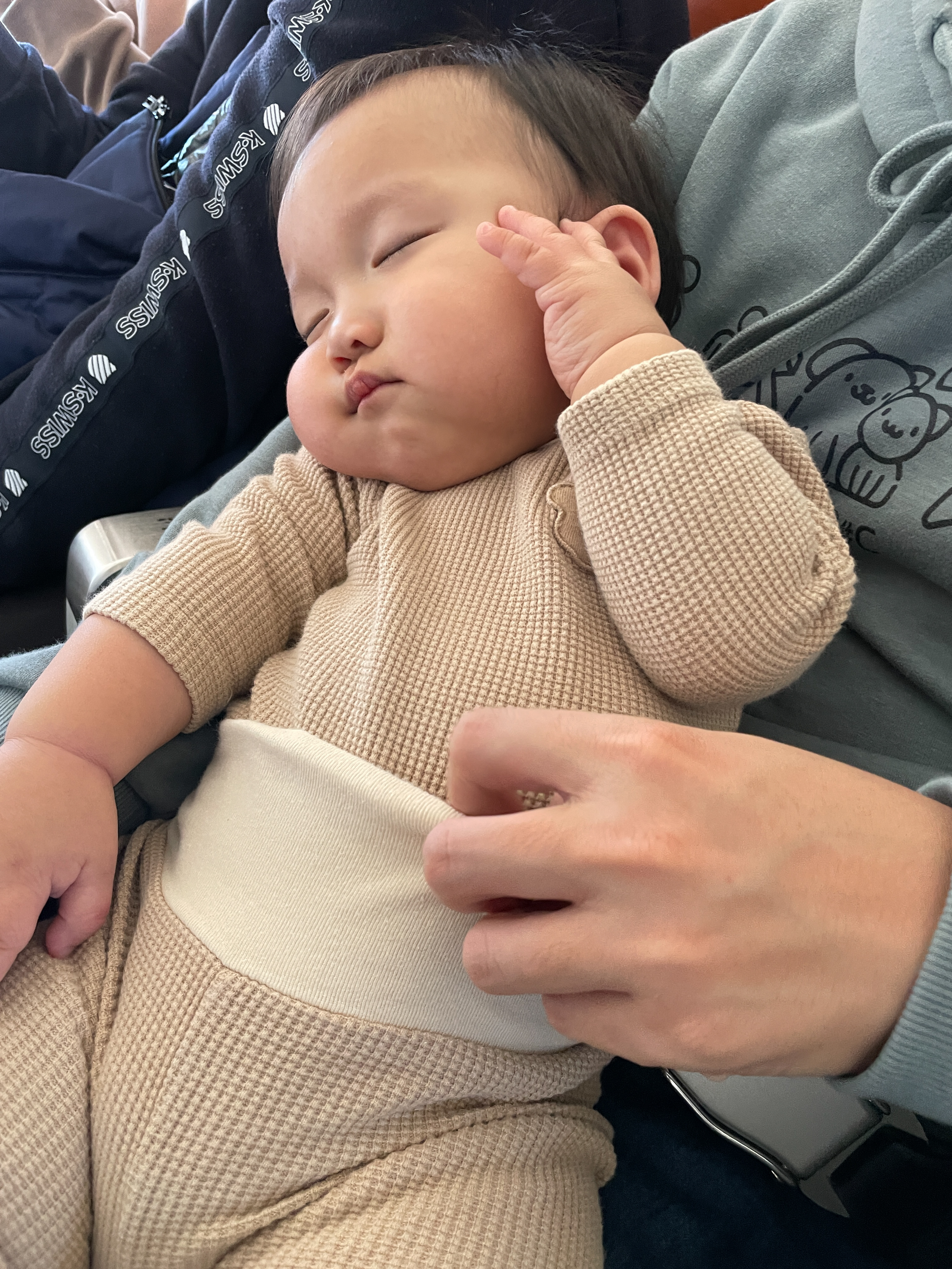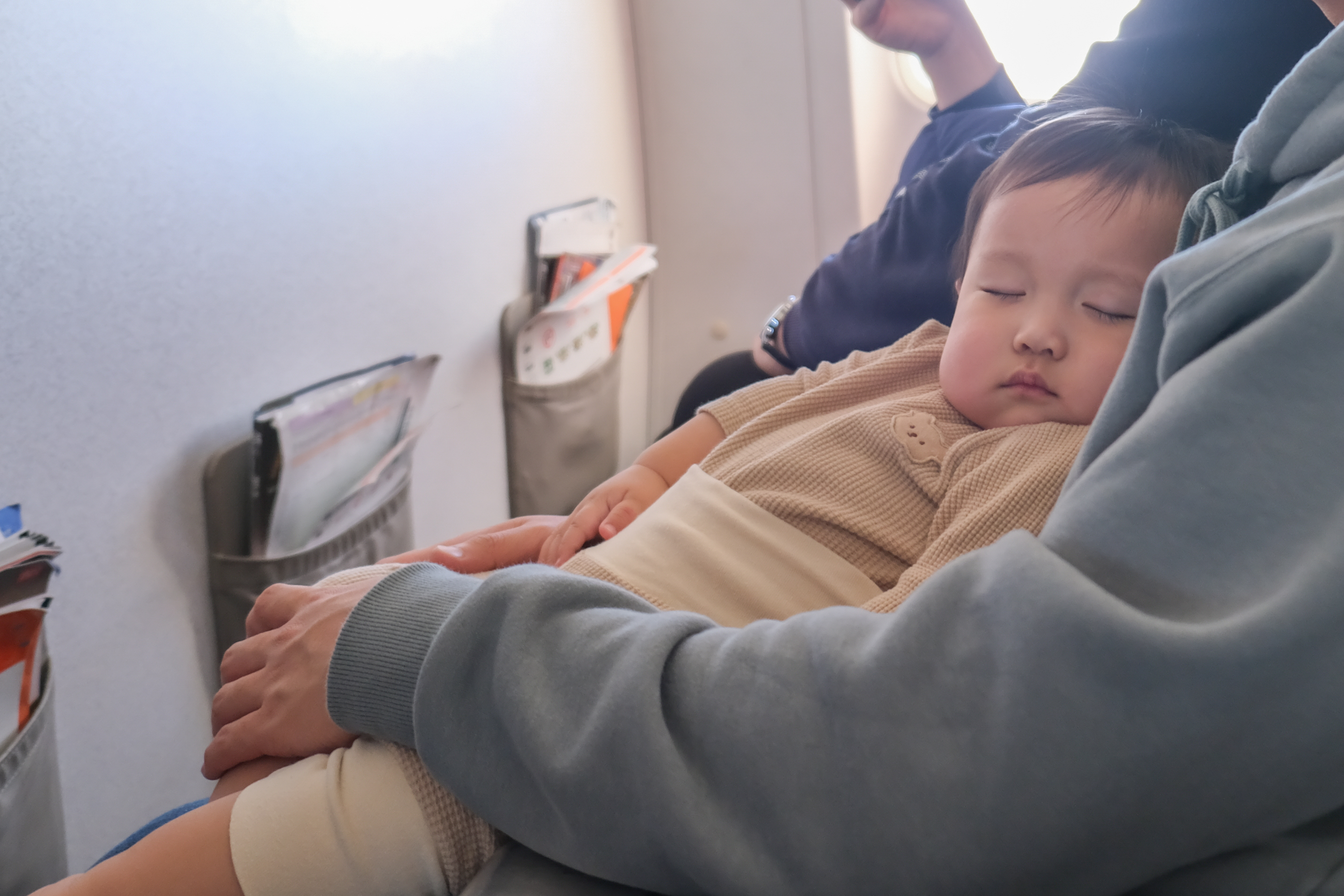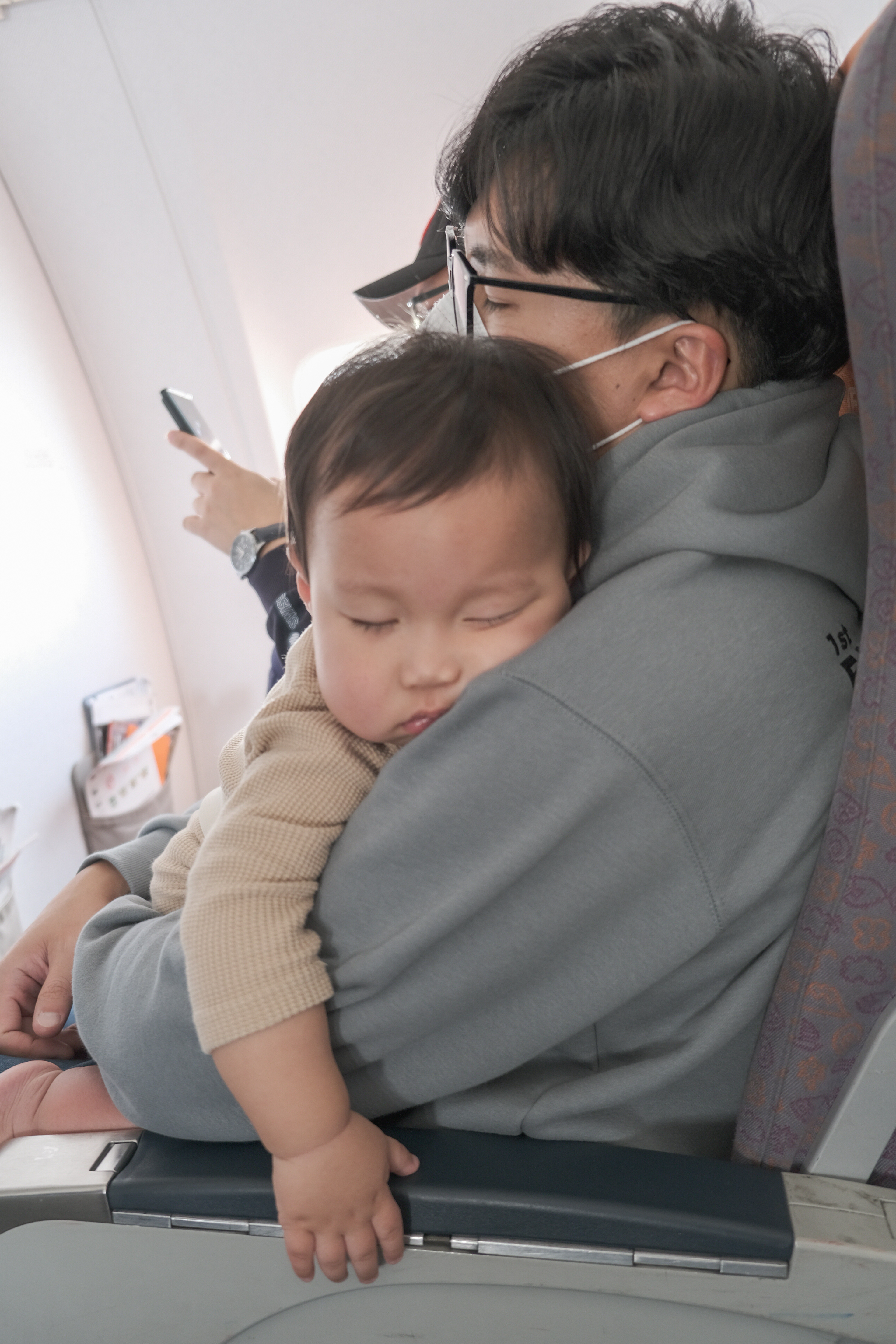 심심해서 찡찡거리다가 이륙한지 30분 만에 잠들어버렸다.