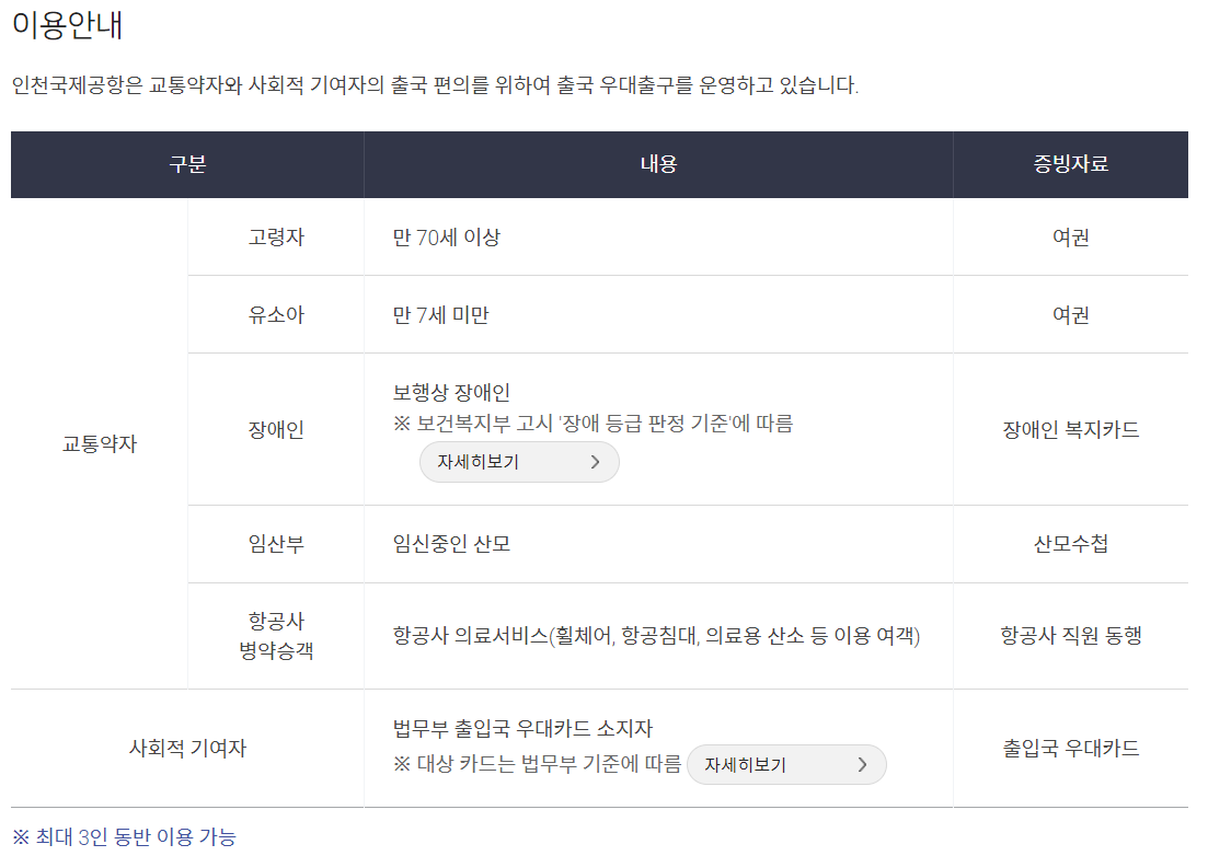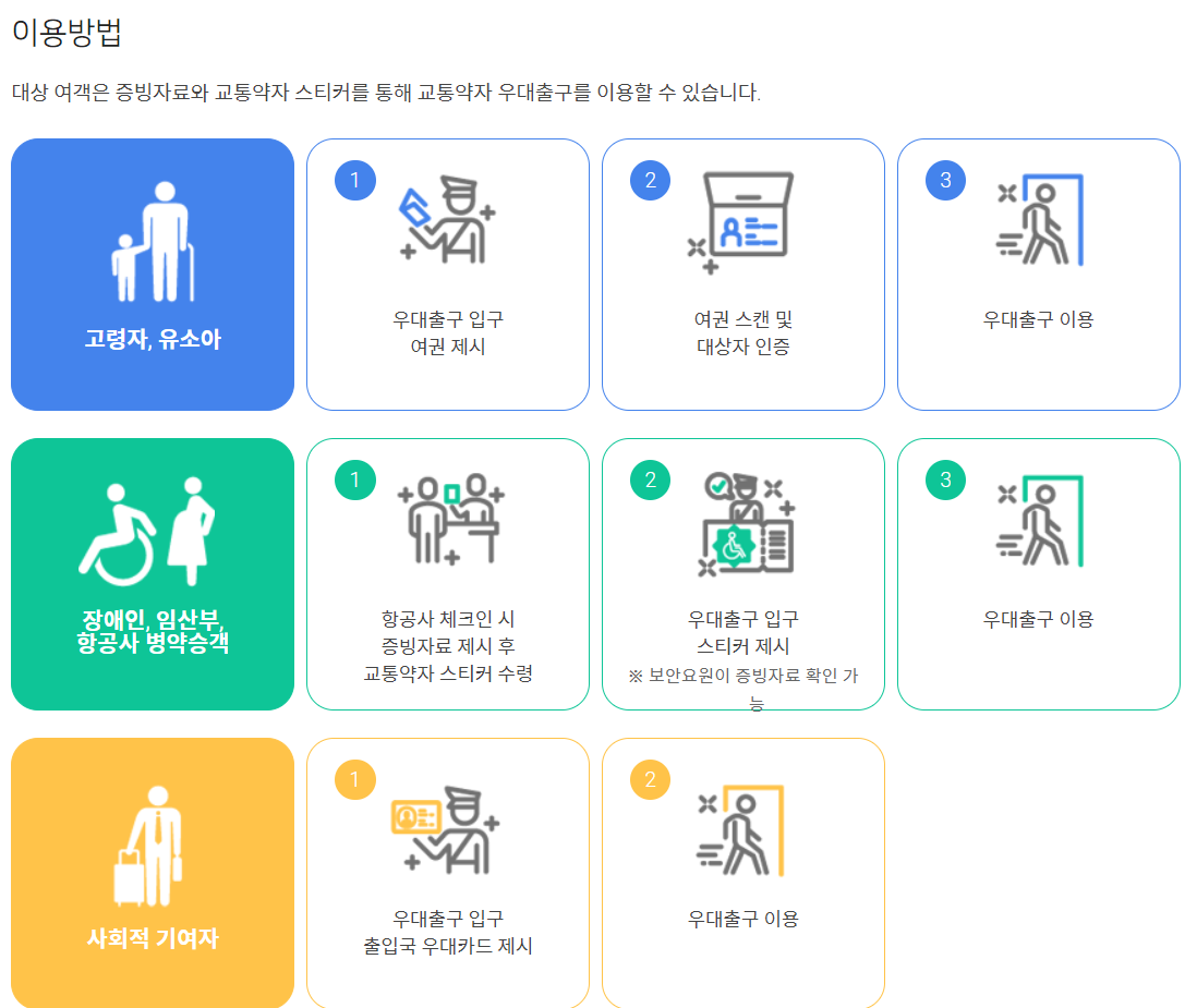 이용방법은 증빙자료와 함께 체크인시 항공사 카운터에서 발급받은 교통약자 스티커를 제출하면 된다.