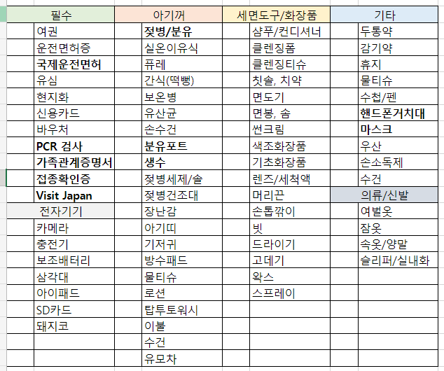 *실온이유식/퓨레/간식: 맘마밀과 풀무원 실온이유식을 챙겼다. 고구마 퓨레와 과일 퓨레도 챙기고 떡뻥과 동결건조 과일들도 챙겼다. 많이 챙겼다고 챙겼는데 모자랐다. 아직 일반식을 못하는 개월수라 먹을 수 있는게 한정되어있어서 아무거나 사먹일 수 없었고, 마트나 편의점을 돌아봤지만 아기들을 위한 간편식을 발견하지 못했다. 여행가기 전에 검색해봤을 때 스벅에서 바나나라도 사서 먹이면 된다는 글을 봤었는데 관광다니다보니 마음처럼 스벅이나 마트에서 과일사먹일 여건이 되지는 않았다. 미리 간편식과 애기 과자를 많이 챙겨가는게 맘편한 것 같다.