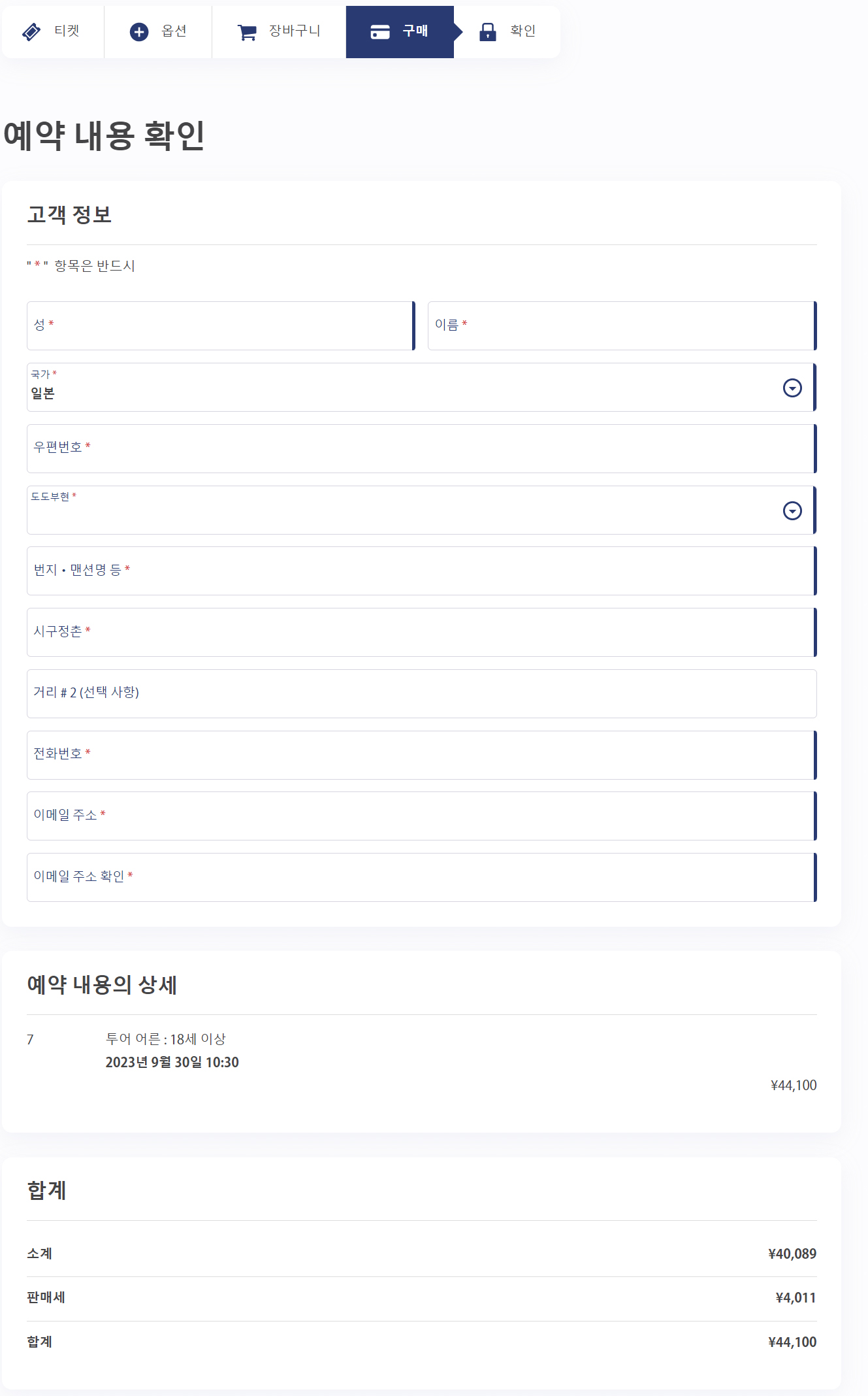 이름, 주소, 전화번호, 이메일 정보를 입력하고 결제를 진행한다.