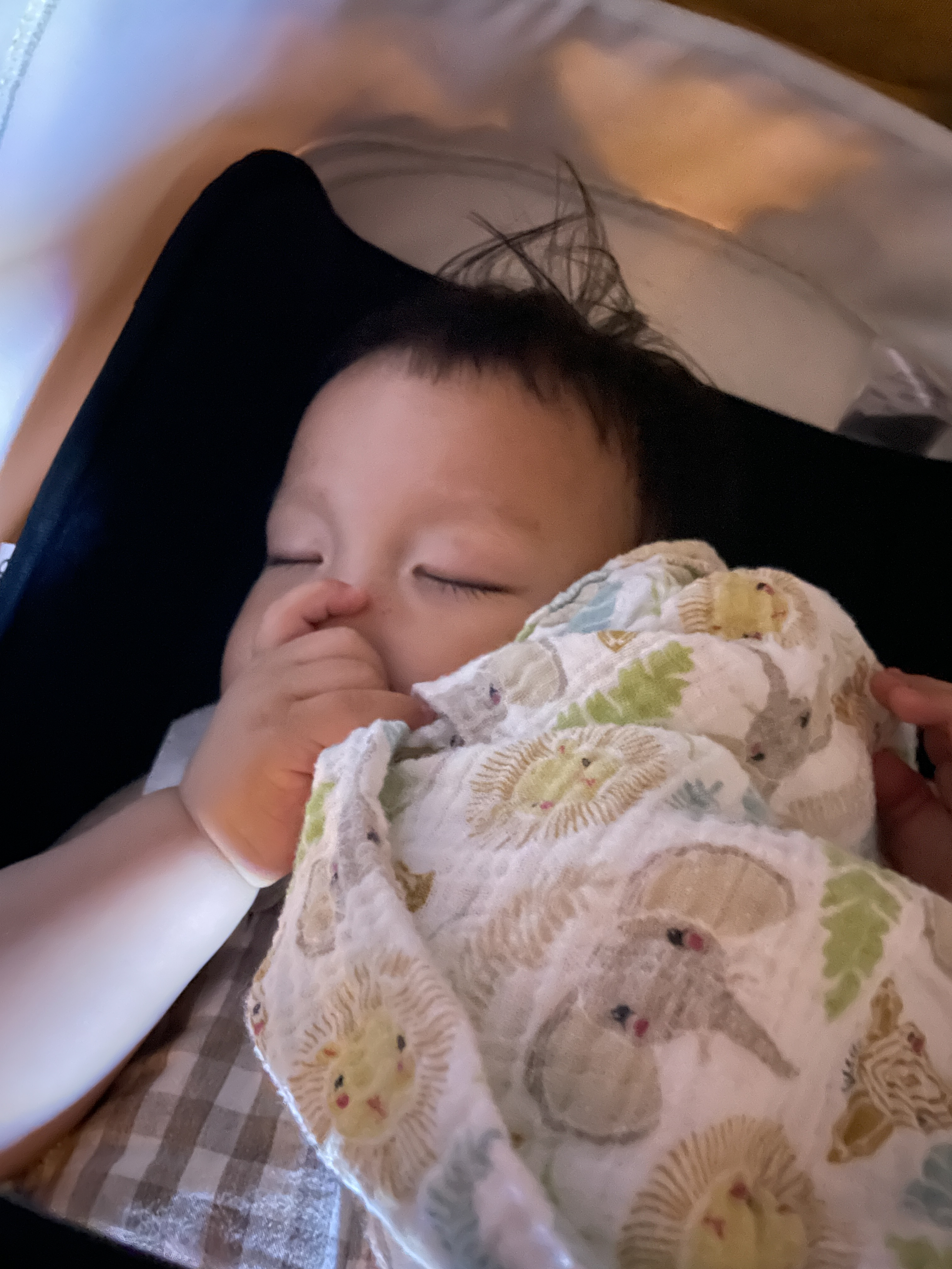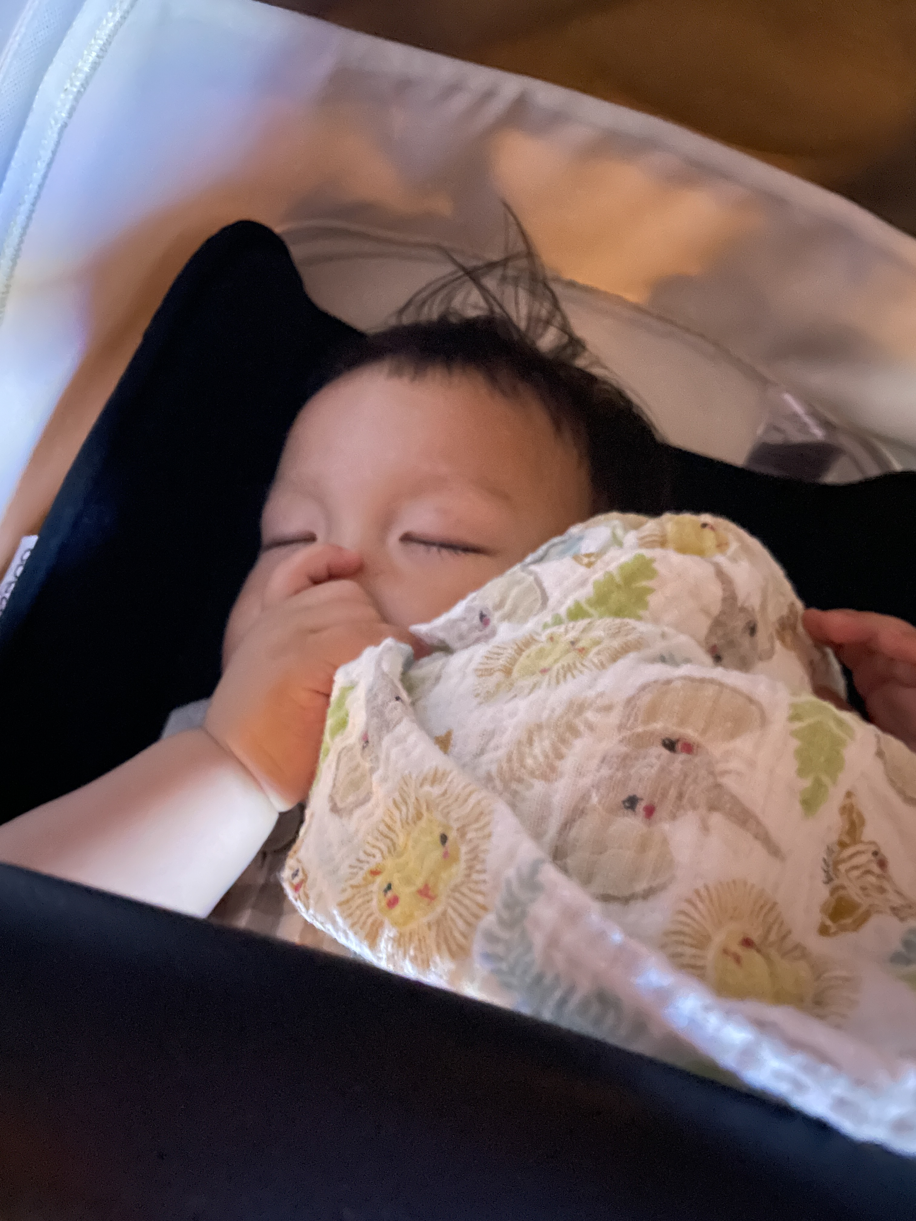 9시가 되니 애착이불을 끌어안고 유모차에서 잠들어 버렸다.