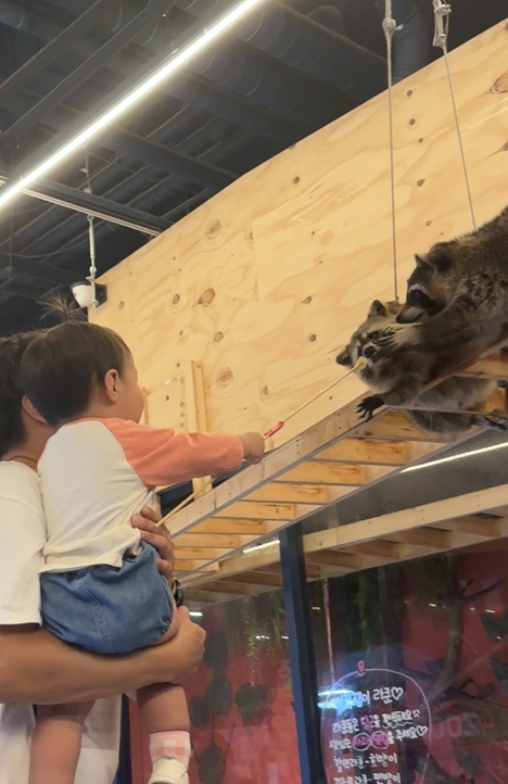 2개월 전보다 좀 컸다고 16개월 된 울 아들래미가 적극적으로 라쿤 먹이주기를 했다.