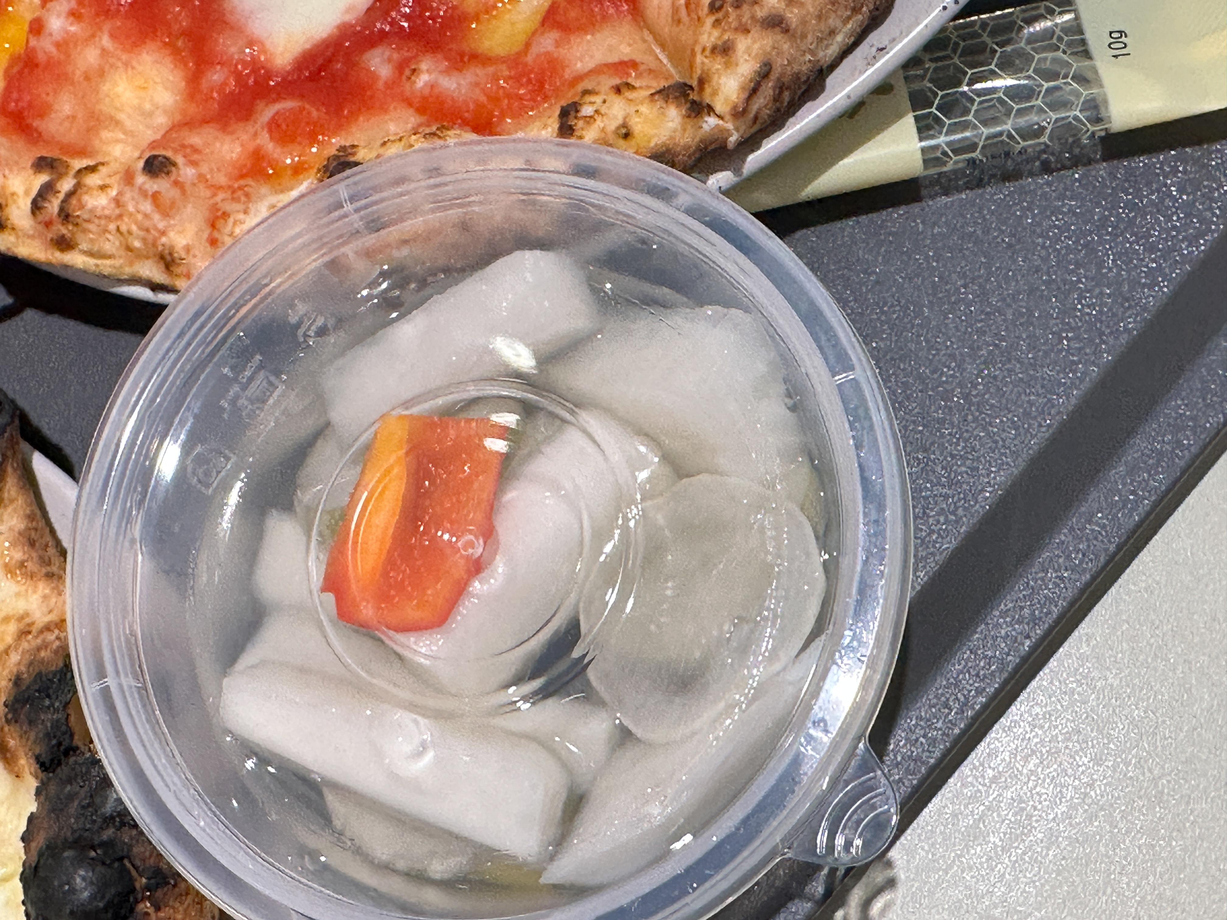 주문한 피자, 피클과 소포장된 꿀을 받아왔다.