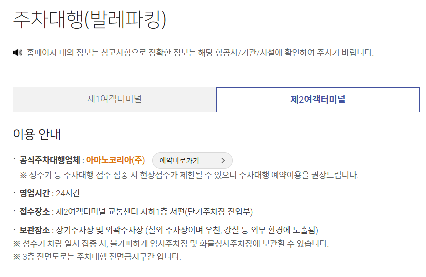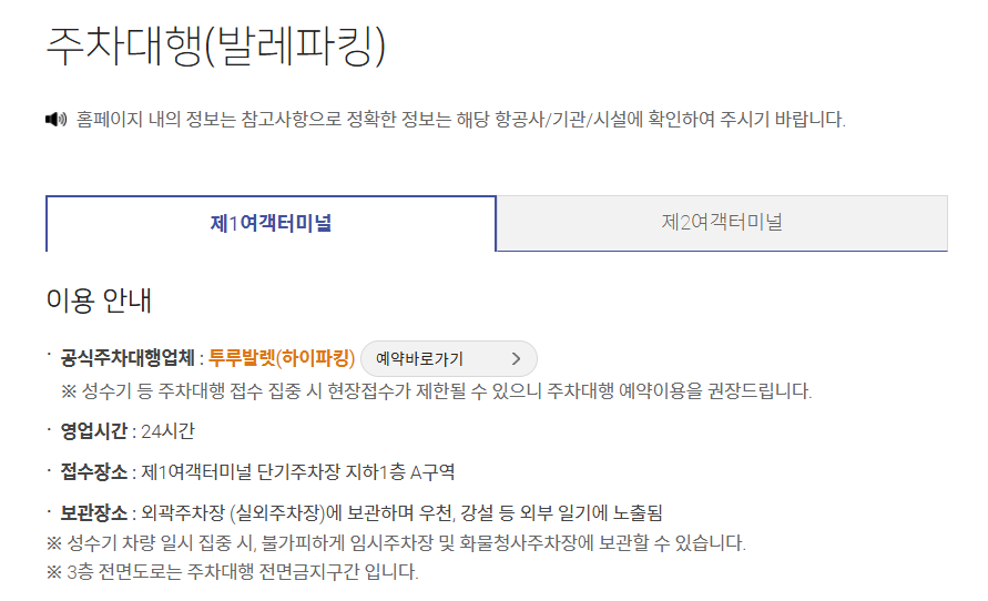 인천공항 제 1여객터미널과 제 2여객터미널의 공식 주차 대행업체가 다르고, 각 터미널마다 차 맡기는 곳/찾는 곳이 다르니 내가 1여객터미널에서 출발하는지 2여객터미널에서 출발하는지 확인하고 주차대행을 예약해야 한다.